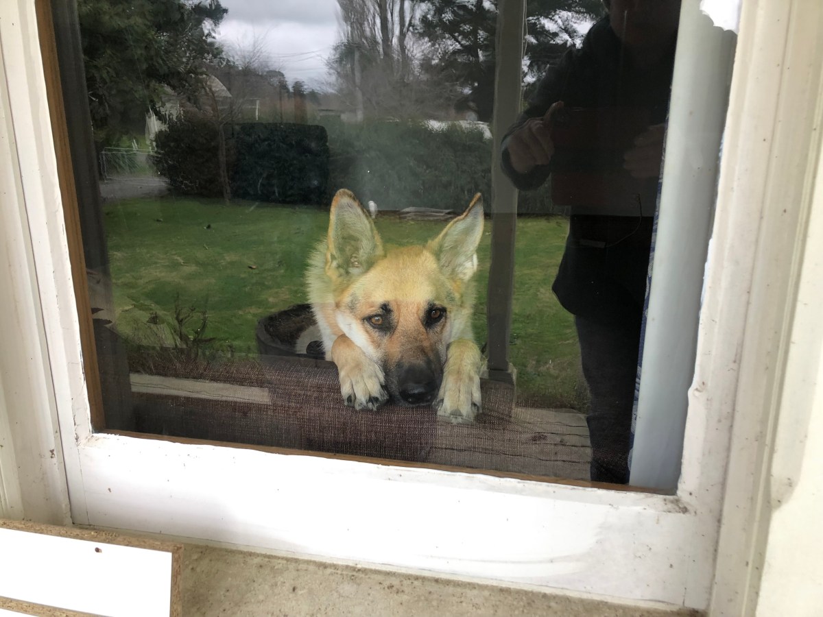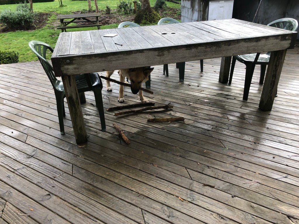 Harvey ist die Kälte ziemlich egal – obwohl er schon auch gerne nahe am Kaminfeuer liegt. Aber trotz Kälte geht er jeden Tag im Fluss baden und tollt draußen herum. Von jedem Spaziergang bringt er einen neuen Stock mit nach Hause, und so sammeln sich in unserem Garten seine Stöckchen an. Eines Morgens kam ich auf die Veranda und mir bot sich folgender Anblick: