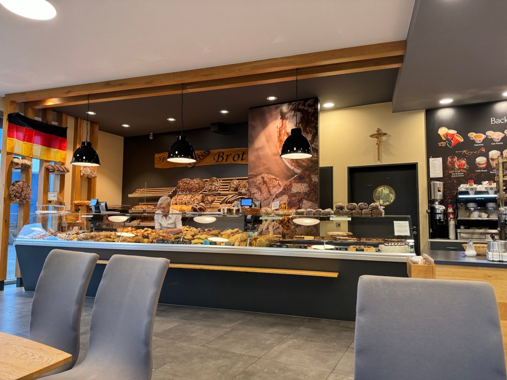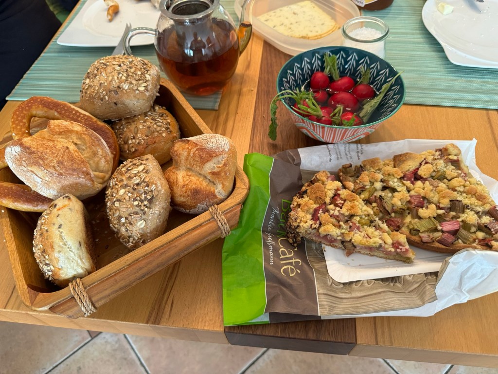 Da wir echt fertig waren von der Reise, ging es nach dem Sekt und Rhabarber-Spritz gleich ins Bett. Leider hatte Paddy die ersten Tage mit Jetlag und der Zeitverschiebung zu kämpfen, so dass er die ersten Nächte nicht viel bzw. gut schlief. So standen wir die ersten paar Tage echt früh auf (während Claudi und Thorsten noch schliefen) und machten einen Morgen-Spaziergang, der natürlich immer beim Bäcker endete. Wie habe ich unsere Bäckereien und das leckere Brot vermisst!!! Jeden Morgen gönnten wir uns dort unseren ersten Kaffee und ein süßes Gebäck als “Vor-Frühstück”, bevor wir bepackt mit Semmeln und Kuchen nach Hause gingen.