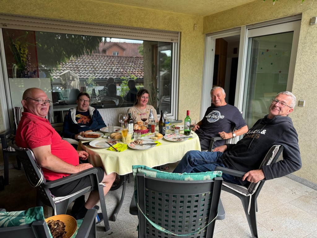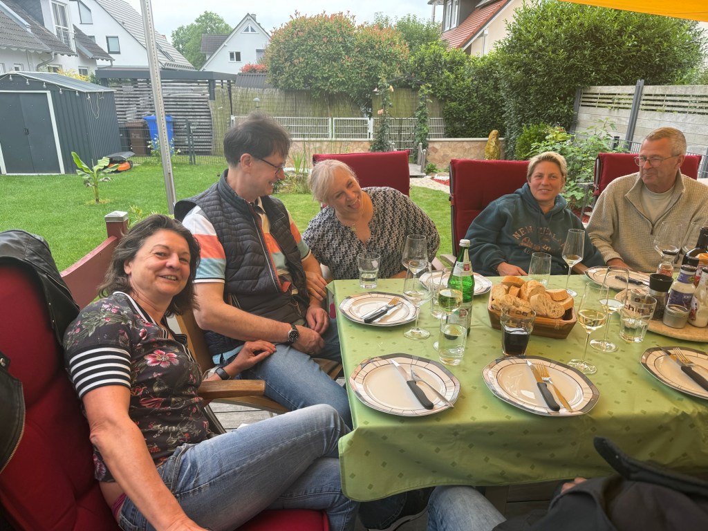 Am Abend hatte Claudi ein paar alte Judofreunde zum Grillen eingeladen: Uli und Sandra, Carmen und Thommy und Anja. Uli, Anja und Carmen (und natürlich Claudi und Thorsten) kenne ich schon fast 35 Jahre, und Carmen hatte ich seit über 30 Jahren nicht mehr gesehen!! Das war so cool, dass sie kamen!!! Wir starteten den Abend mit jeder Menge leckerem Grillgut (Fleisch, Spieße, Lachs und Grillkäse), Salat und Brot, danach gab es Anja’s berühmtes Tiramisu und nach all dem Essen brauchten wir natürlich einen Verdauungsschnaps!