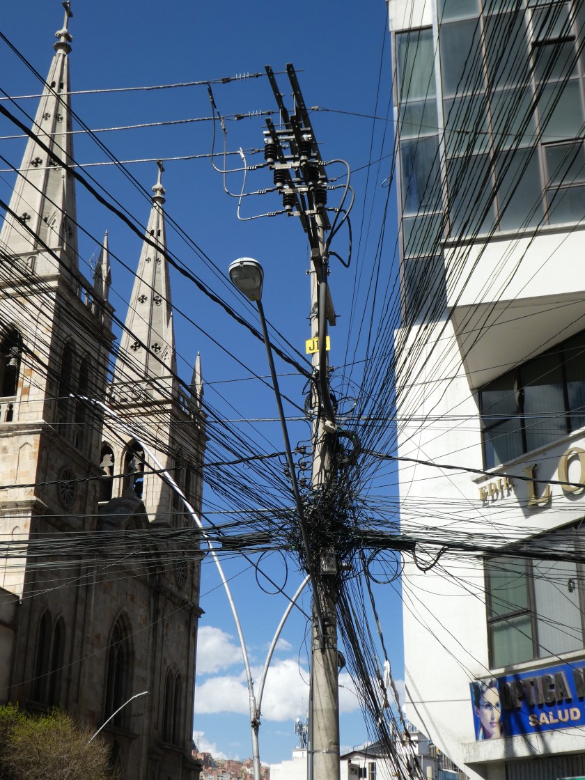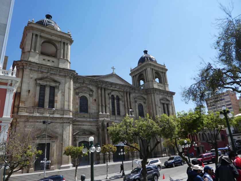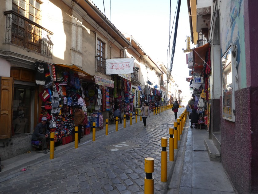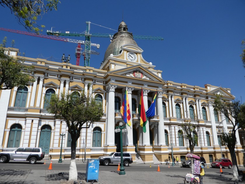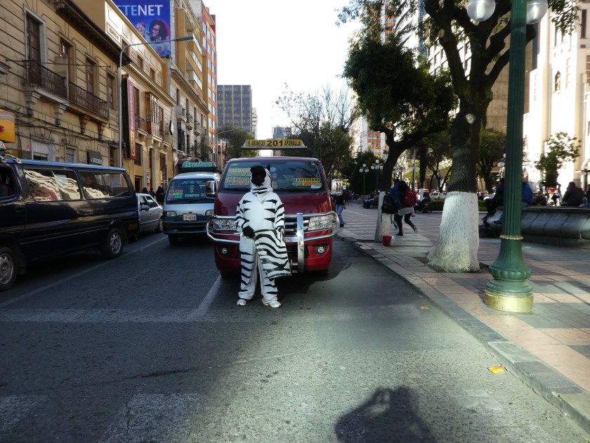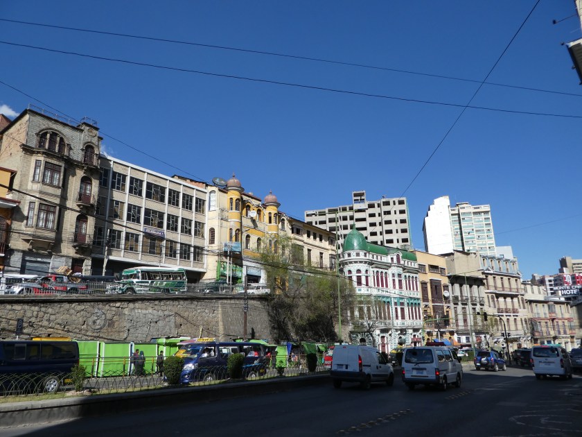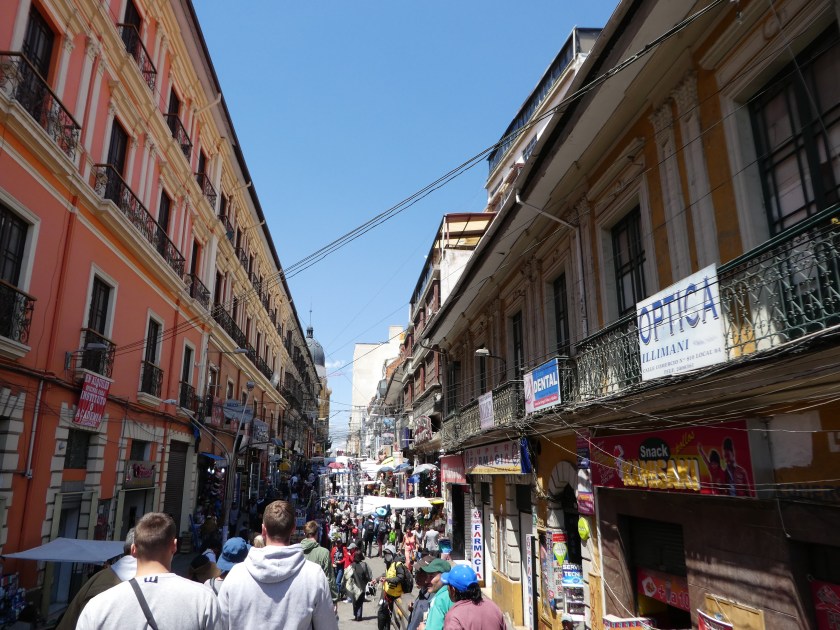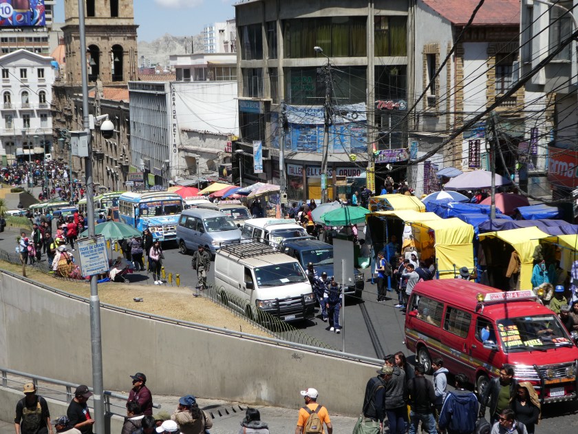 Danach verließen wir den eher indigenen Teil der Stadt und machten uns durch das Kolonialviertel auf den Weg zur Plaza Murillo, dem bekanntesten und wichtigsten Platz der Stadt. Hier noch ein kleiner Eindruck vom normalen Verkehrschaos um die Plaza San Francisco: