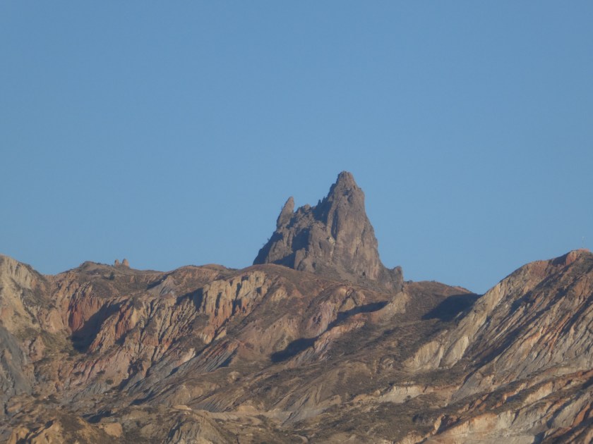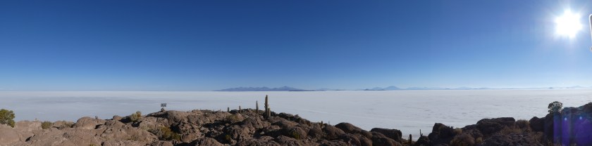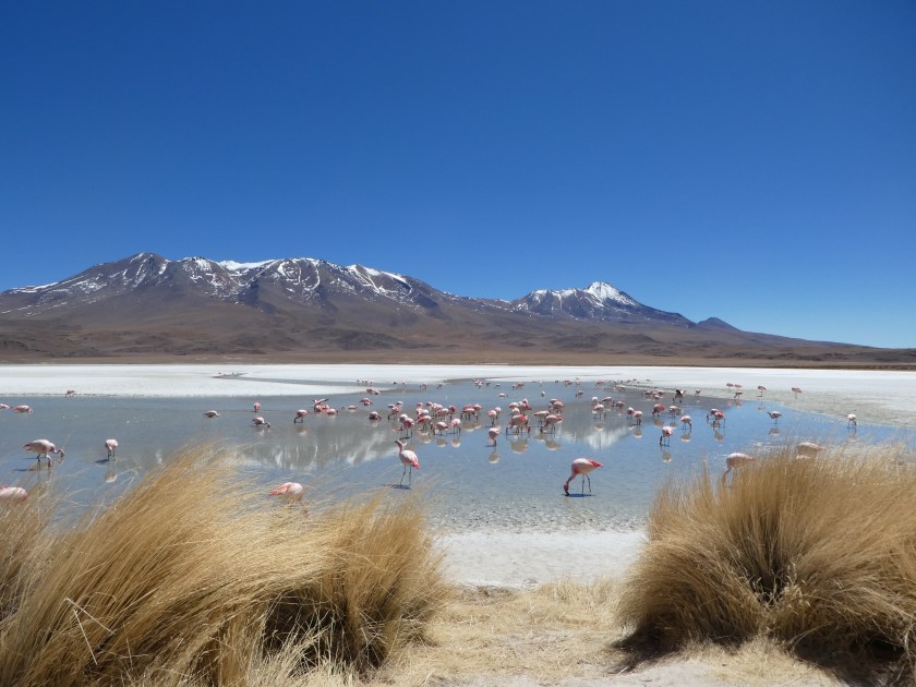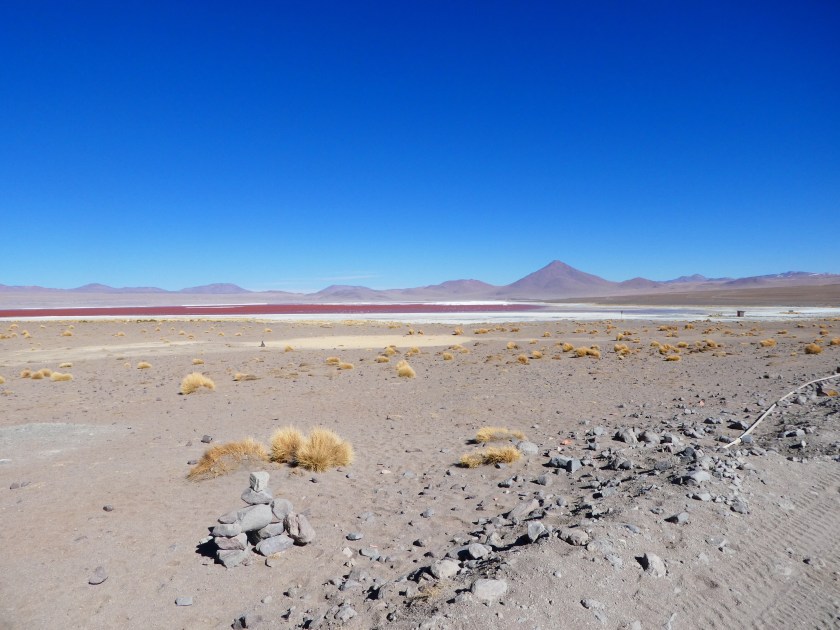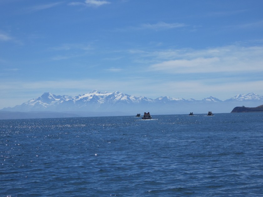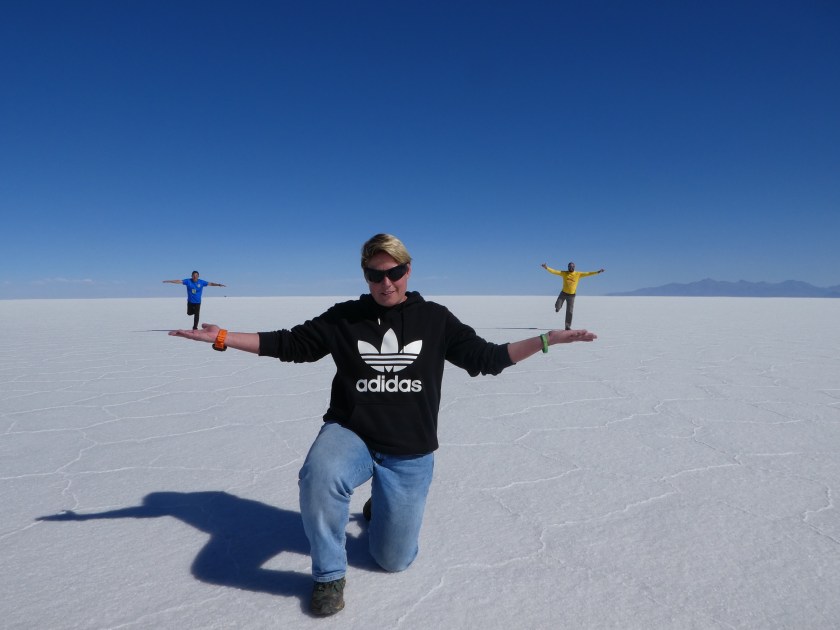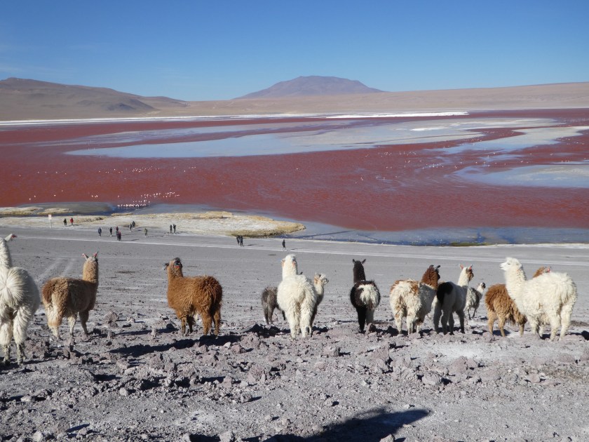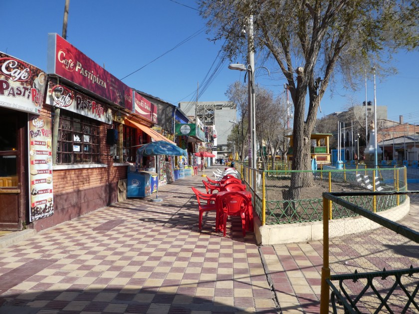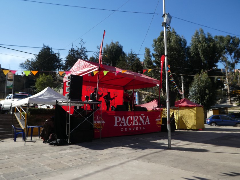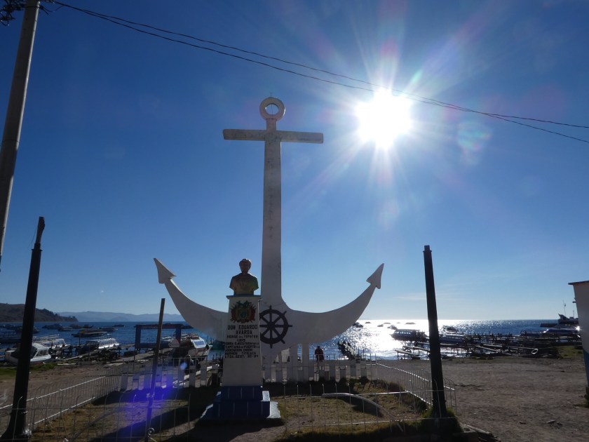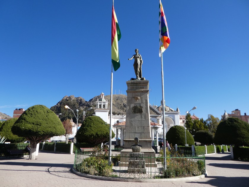 Die linke Fahne in den Regenbogenfarben steht übrigens für alle indigenen Völker, von denen es in Bolivien 36 gibt. Die mittlere Flagge ist die Nationalflagge, die rechte Flagge ist laut Marie „die Flagge der Hoffnung“, es ist die „Naval flag“ (irgendwann, bevor Bolivien einen Krieg mit Chile verlor, hatte Bolivien ein Stück Küste), die zeigt, dass Bolivien immer noch darauf hofft, irgendwann wieder Zugang zum Meer zu bekommen.