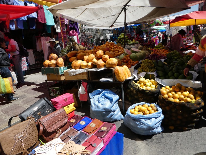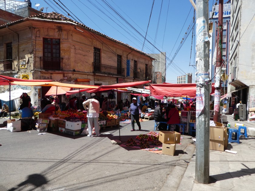 Dann ging es weiter zu den Märkten. Da einer in den anderen übergeht und irgendwie sowieso alles überall verkauft wird, erspar ich euch die Namen der „einzelnen“ Märkte 😜. Es war Samstag und somit Markttag, und dementsprechend ging es zu mit allem, was dazu gehört: Gedränge, Marktschreier, viele verschiedene Gerüche (manche gut, andere eher nicht so), Cholitas (indigene Marktfrauen in ihren berühmten Kostümen) und eine wahre Farbüberflutung. Angeblich erstrecken sich die Märkte über 40 Blöcke – aber irgendwie ist eh ganz La Paz ein einziger Markt.