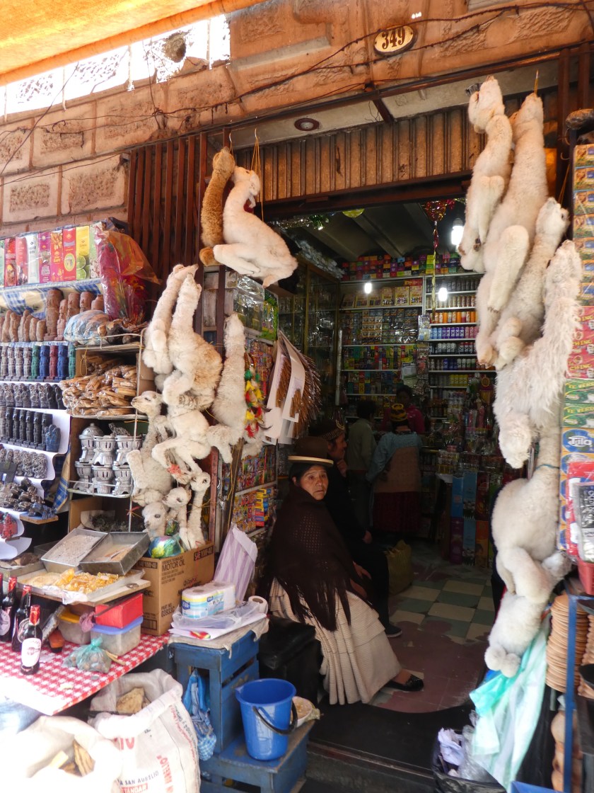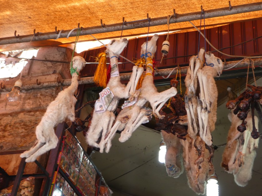 Der einzige Markt, der anders ist, ist der Mercado de las Brujas, der Hexenmarkt. Dort gibt es alles mögliche Zeug, das man hier gerne Pachamama (Mutter Erde) opfert, um sie gnädig zu stimmen: 96%iger Alkohol, jede Menge Süßkram (sie steht wohl auf Süßigkeiten 😜), Amulette, tote Lamababies oder Lamaföten, usw…