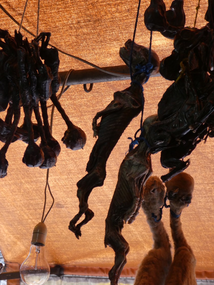 Angeblich müssen die Lamababies aber eines natürlichen Todes sterben, sie werden nicht zu Opferzwecken getötet. Und für welche Gelegenheiten braucht man nun so einen Lamafötus? Der wird, wenn man ein Haus baut, in die Baugrube und das Fundament geworfen, um das Haus zu beschützen – natürlich zusammen mit Alkohol, Süßigkeiten und Kokablättern.