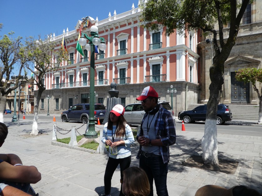 Der Wohnsitz des Präsidenten (Palacio Quemado), der aber nicht mehr als Wohnsitz genutzt wird, seit ein Präsident dort von Regierungsgegnern getötet wurde. Im Vordergrund unsere beiden Guides Marie und Max von der Red-Cap-Agentur, sie waren wirklich gut! Und es war die erste Führung auf Englisch für mich bisher 😬👍🏻