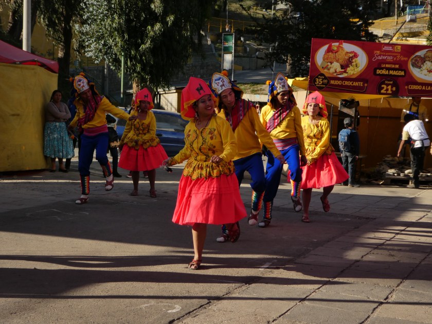 Nach dem Essen bekam ich sogar noch eine Tanzshow geboten! Während eine Band während des Essens bolivianische Musik spielte, traten dann danach diese acht Frauen und Männer auf: