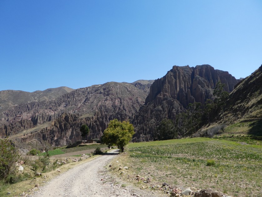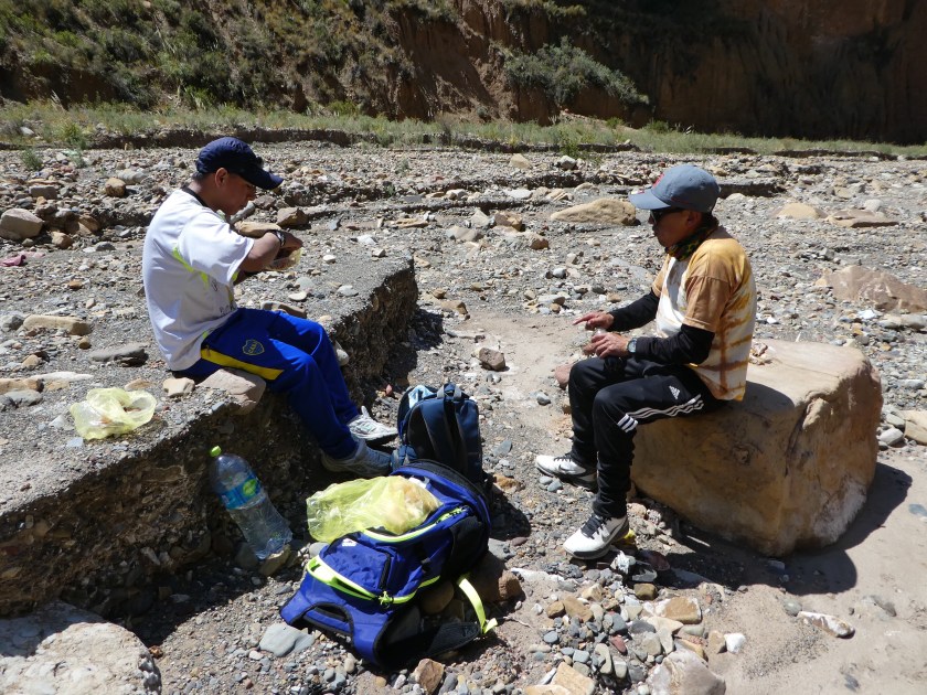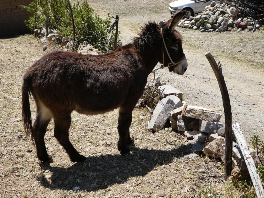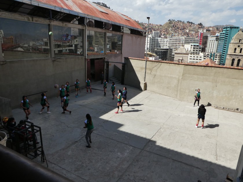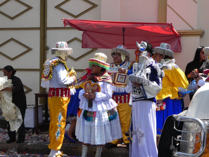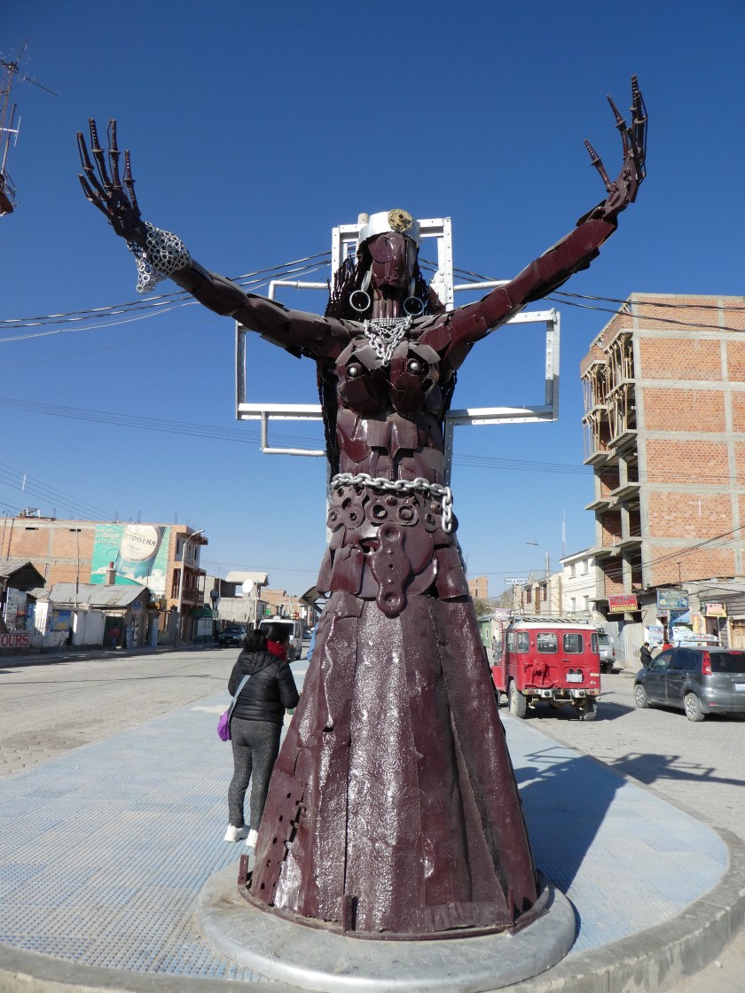 Hier sieht man ansatzweise die Tracht, die typisch ist für indigene Frauen in Bolivien (ich muss die Tage nochmal auf den Markt und eine Cholita fragen, ob ich ein Foto machen darf): der Bowlerhut, der über den Beziehungsstatus Auskunft gibt (gerade auf dem Kopf heißt vergeben, schief bedeutet noch zu haben), lange Ärmel, um die Haut zu schützen, und einen Petticoat mit möglichst vielen Schichten, damit die Frau möglichst breit in der Hüfte wirkt. Das Schönheitsideal hier ist etwas anders als bei uns, hier steht Mann auf gebährfreudiges Becken, eher kräftige (auch muskulöse) Frauen mit strammen Waden, die die Berge hochlaufen können mit Kind auf dem einen Arm und einem Sack Kartoffeln im anderen. Wenn eine Cholita einen Mann interessant findet, zieht sie ihren Rock etwas nach oben und zeigt ihm ihre (hoffentlich muskulöse) Wade. Tja, andere Länder, andere Sitten 😊.
