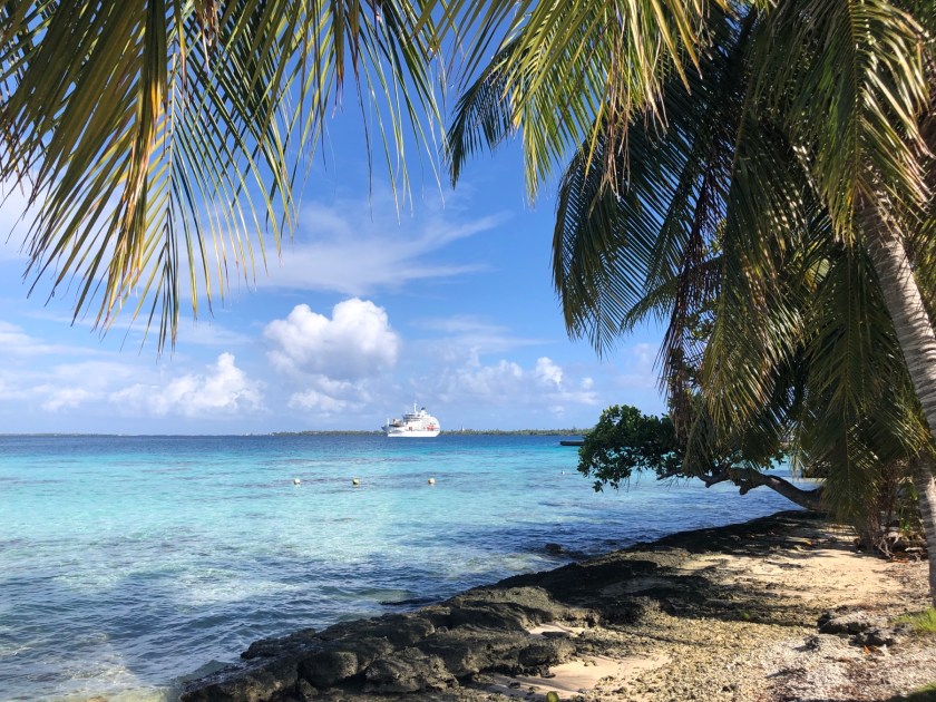 Die Aranui beim Wendemanöver – vorne (und hinten) waren nur wenige Meter Platz bis zu den Felsen!