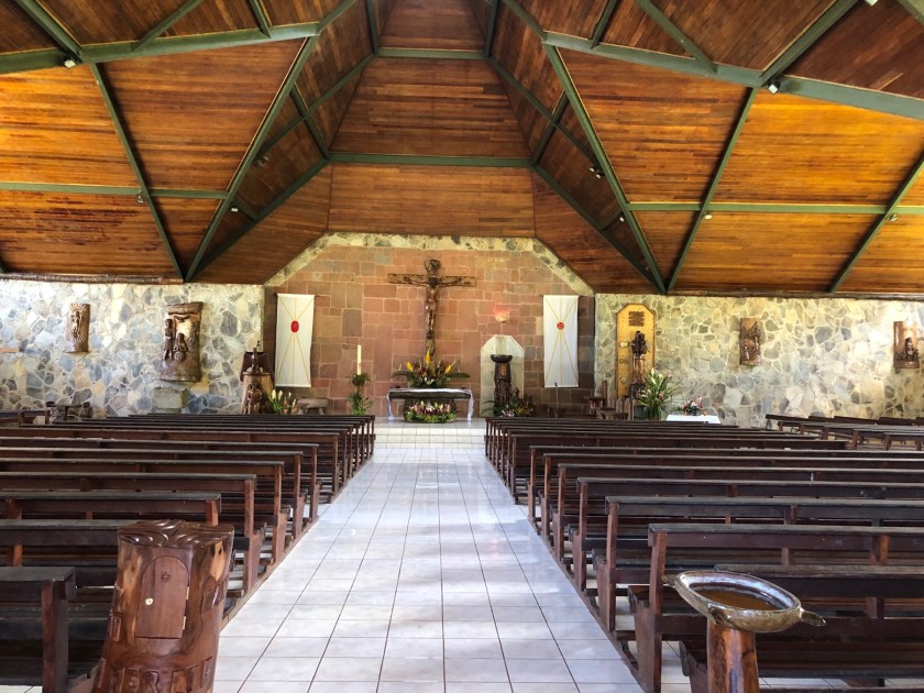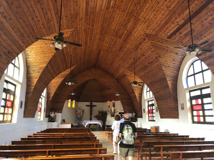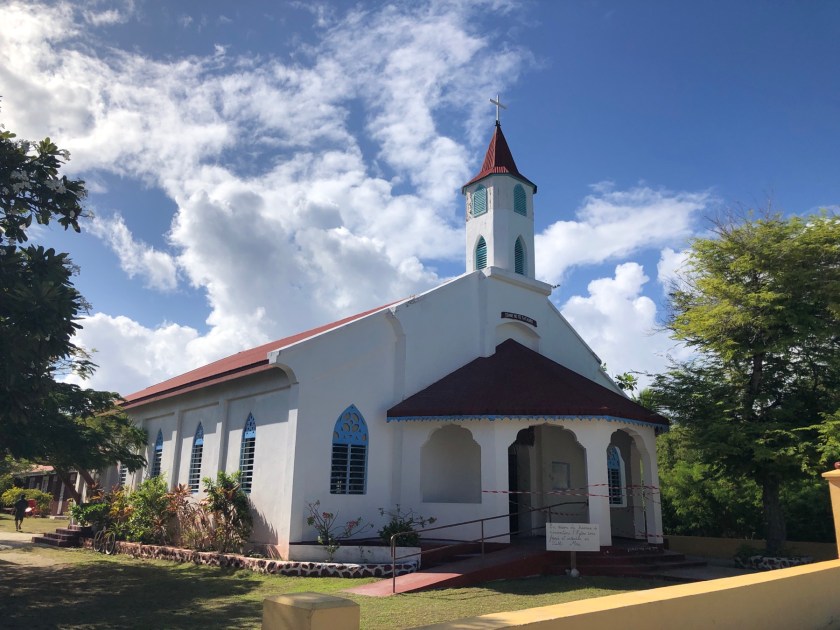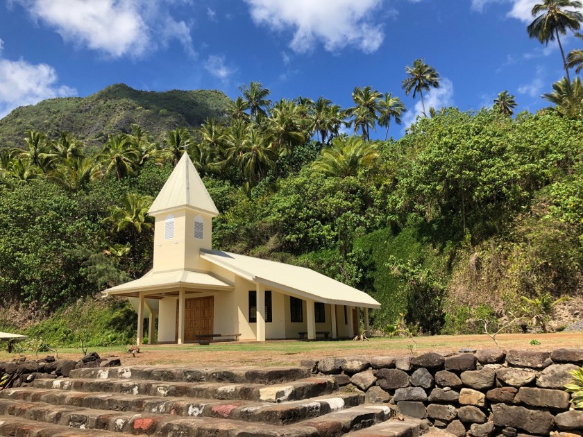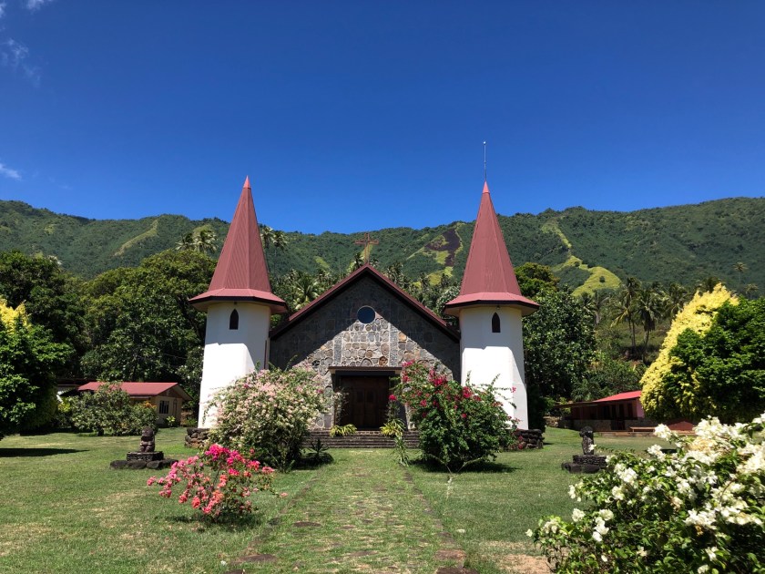 Die Kathedrale in Taiohae. Wie überall wurde auch in den Marquesas fleißig missioniert, und im Namen der Kirche Tänze, Gesang und Tatoos verboten, so dass sehr viel marquesanische Kultur und Tradition verloren ging.