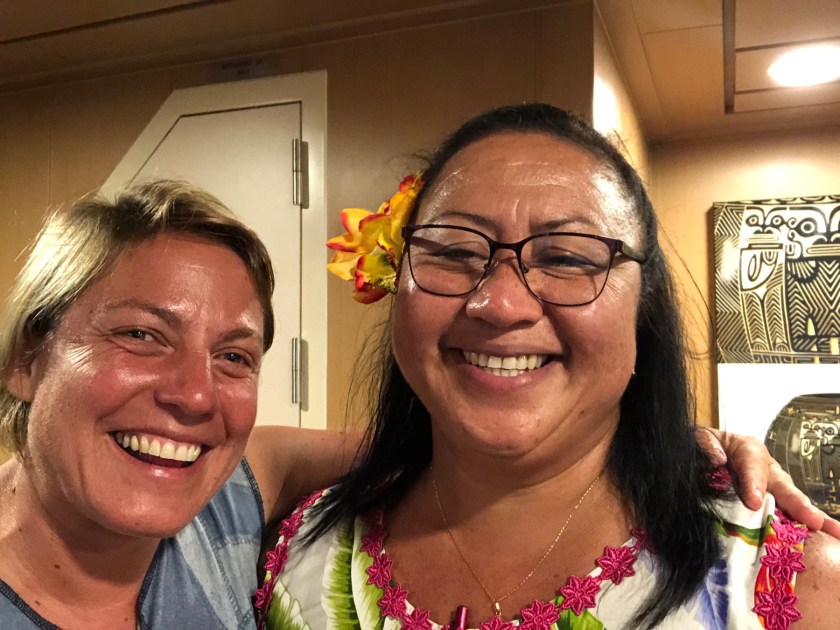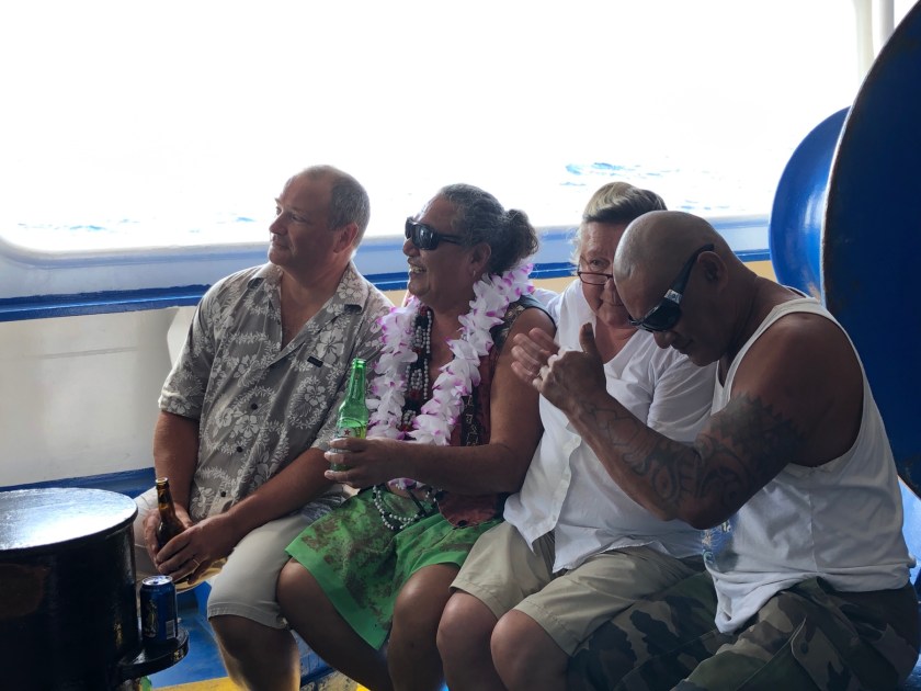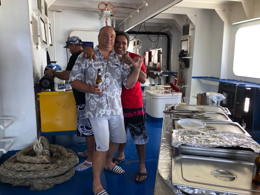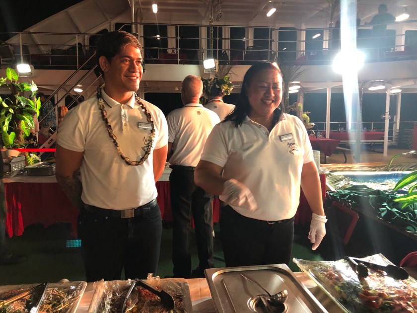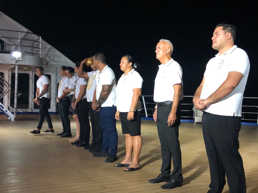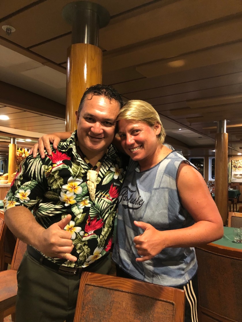 Rührende Verabschiedung des Barmannes Joe nach 25 Jahren Dienst auf der Aranui – die ganze Mannschaft sang für ihn und überreichte ihm Geschenke, was ihn zu Tränen rührte!