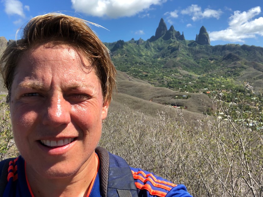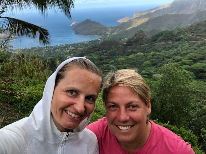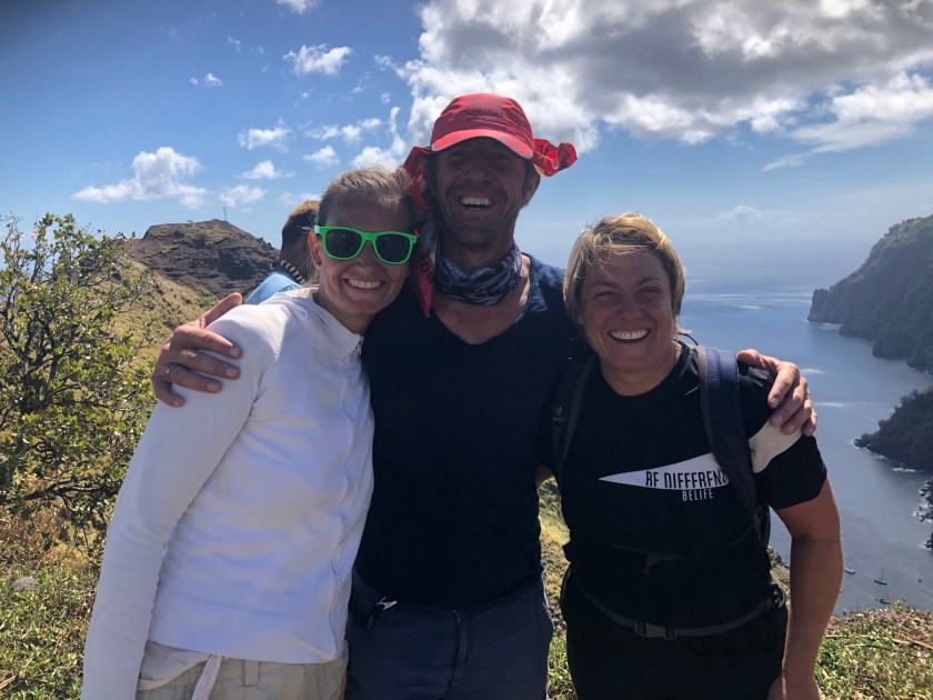 Britta, Jörg und ich hoch über der Bucht von Hanavave.