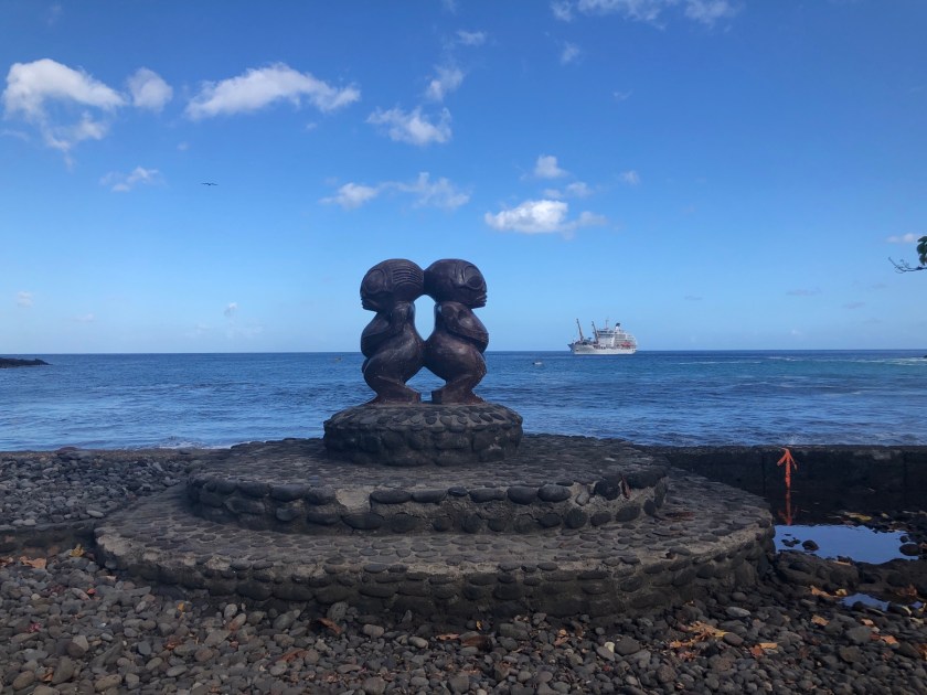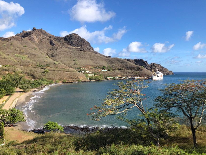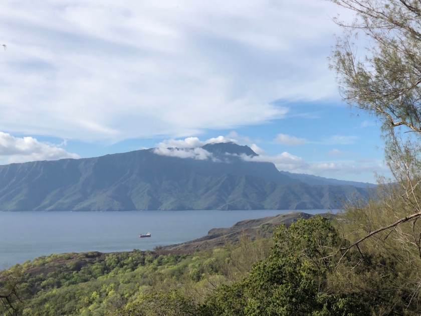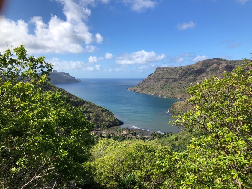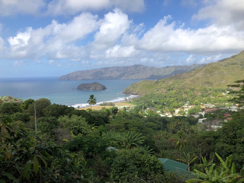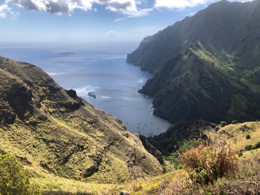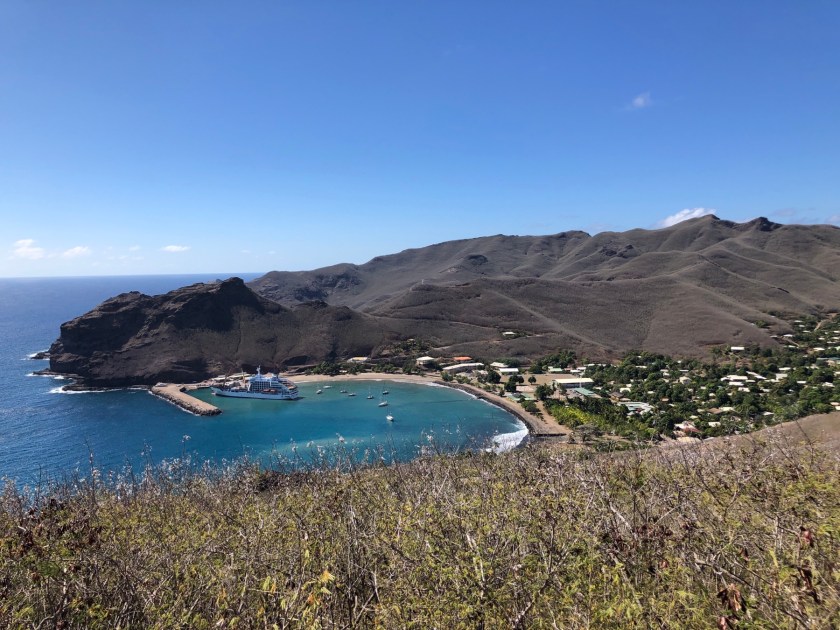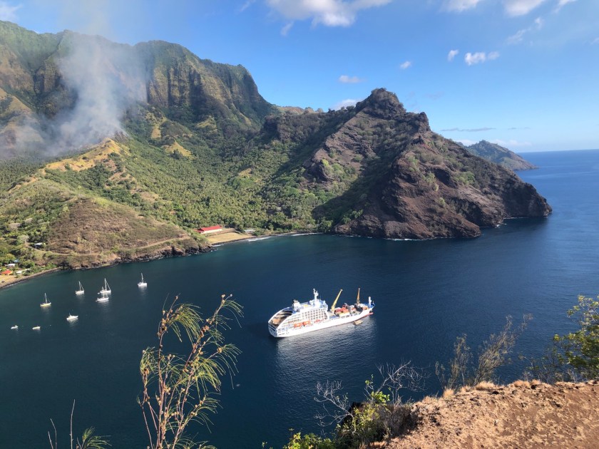 Blick über die Bucht, in der gerade die Aranui ausgeladen wird. Auf der anderen Seite sieht man die Straße, die ich am Vormittag hochgelaufen war.