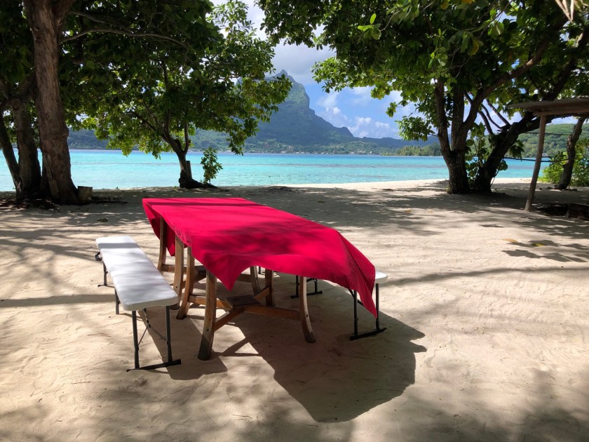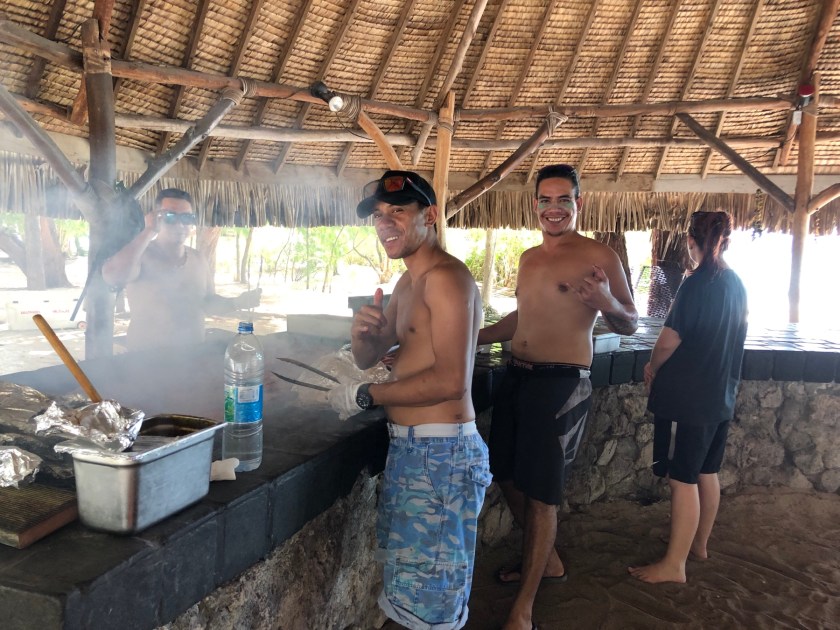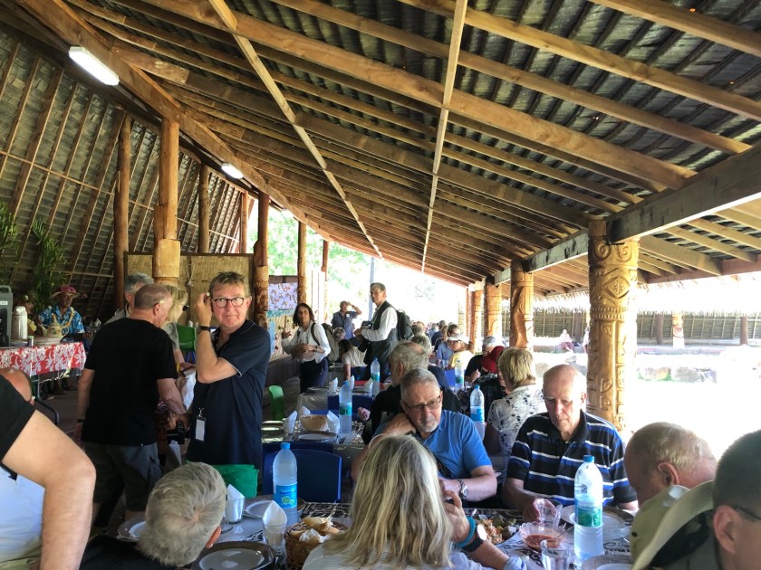 Die (englisch-deutschsprachige) Hälfte der Aranui-Touristen beim Verspeisen des 7-Gänge-Umu-Menüs. Die Franzosen waren in einem anderen Restaurant, da nicht genug Platz für alle gewesen wäre.