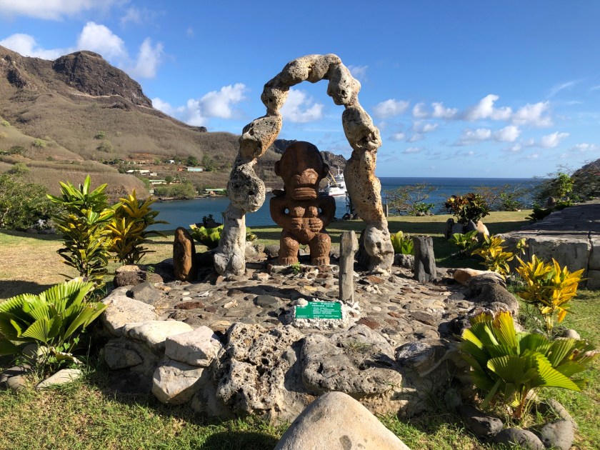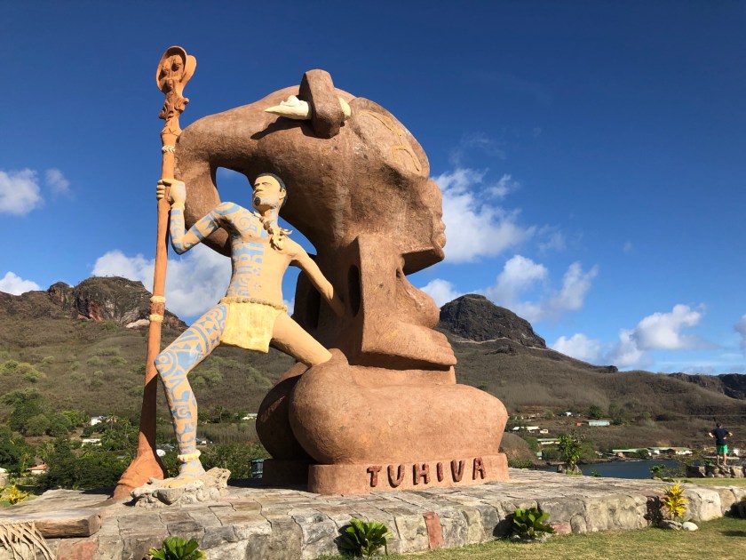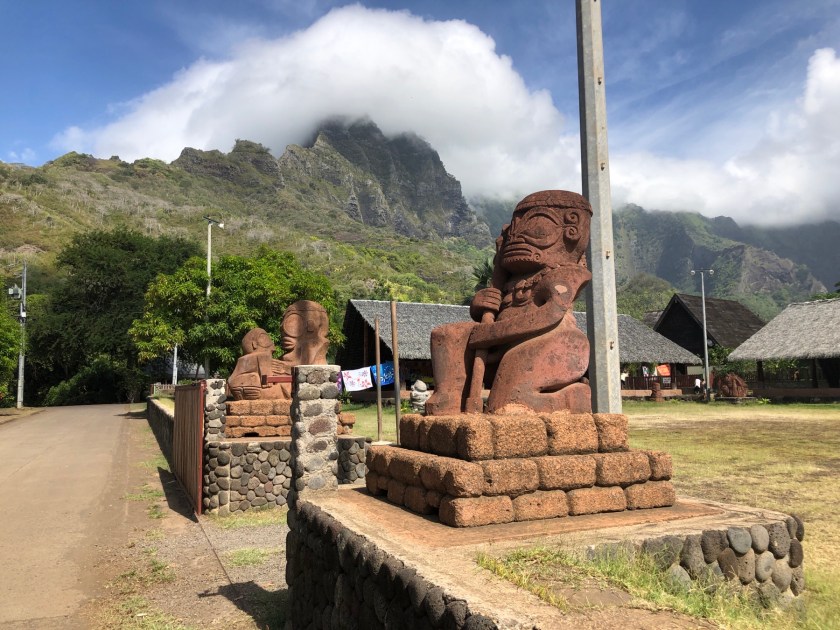 Tikis am Hauptplatz von Atuona vor toller Bergkulisse.