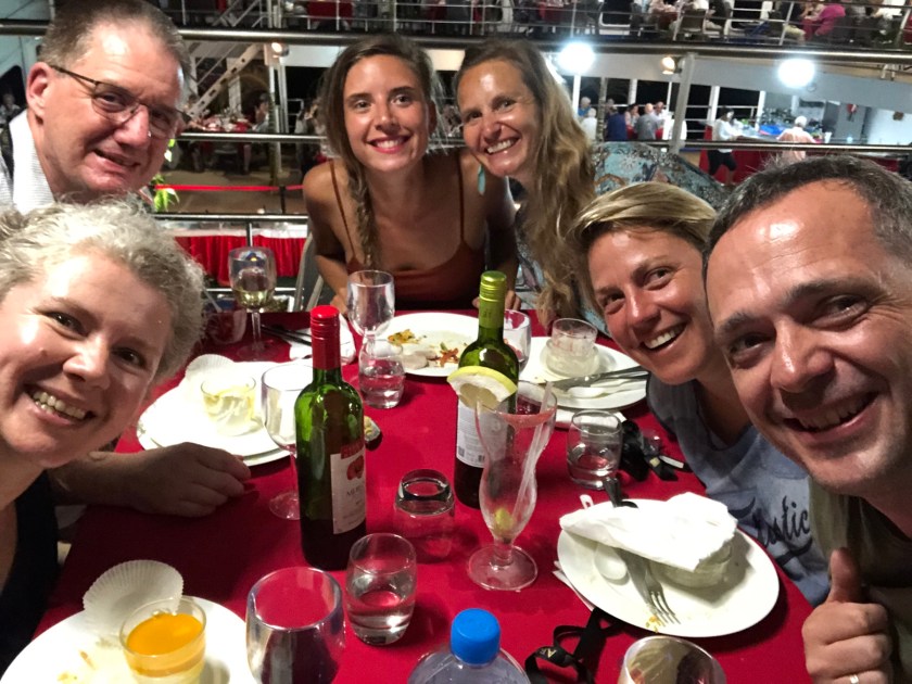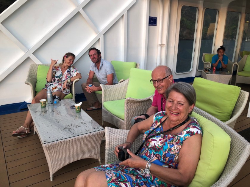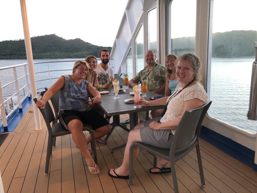 Beim Cocktailtrinken und Genießen des letzten Sonnenuntergangs auf der Aranui: Anna und ich im Vordergrund mit vier Franzosen am Tisch (Clem, einer der Offiziere, Hugues und Evelyne).