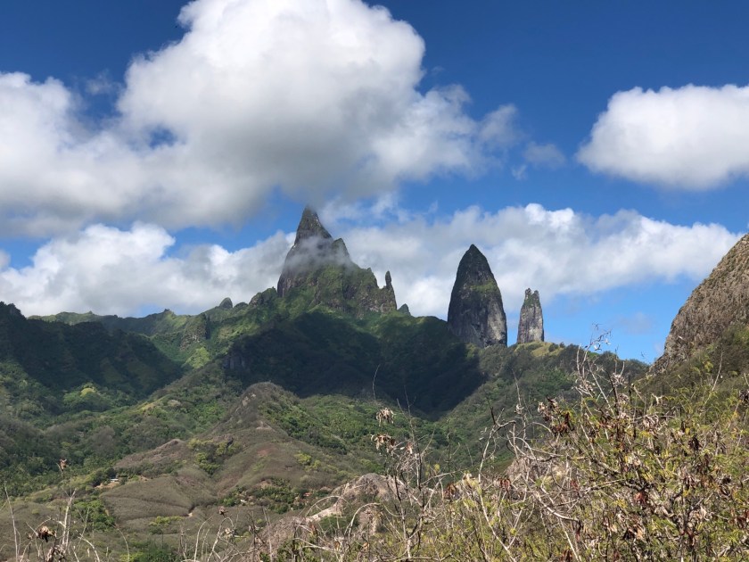Blick über den Strand auf die noch in den Wolken versteckten Zinnen, für die Ua Pou berühmt ist.