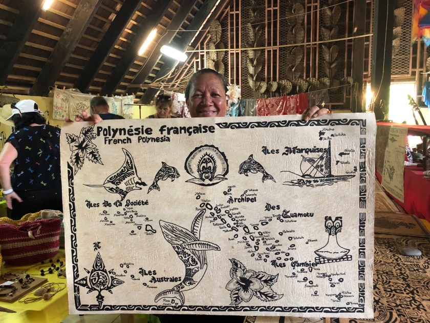 Stolze Künstlerin mit ihrem Kunstwerk auf dem artisan market: eine Karte von Französisch Polynesien auf Tapa, also Baumrinde, gemalt.