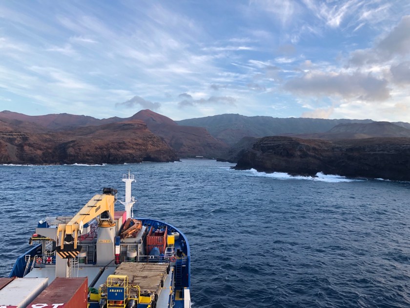 Die Aranui kurz vor der Einfahrt in die enge Bucht.