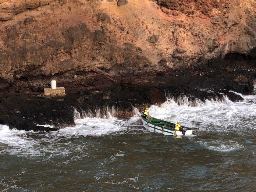 Zwei Seeleute beim waghalsigen Anlegemanöver bei heftigem Seegang: der vordere Mann springt raus aus dem Boot auf den Felsen, befestigt das Seil und springt dann zurück ins Boot.