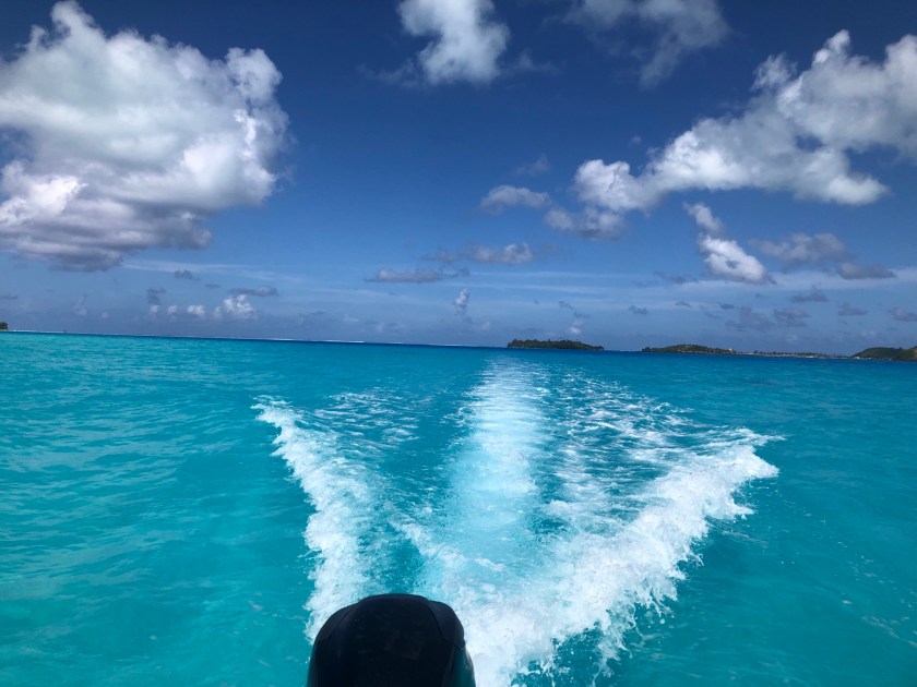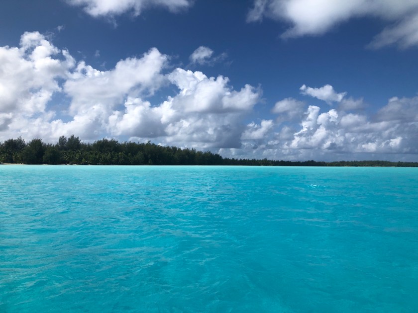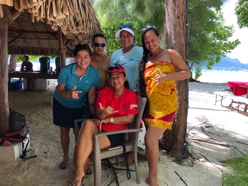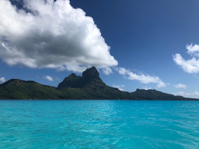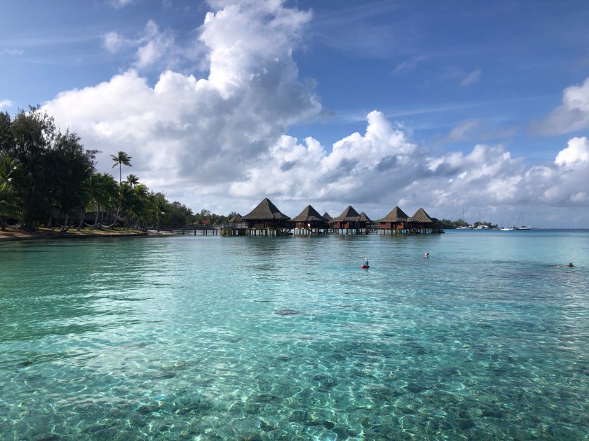 Drei Deutsche im türkisfarbenen Wasser, im Hintergrund der Berg von Bora Bora.