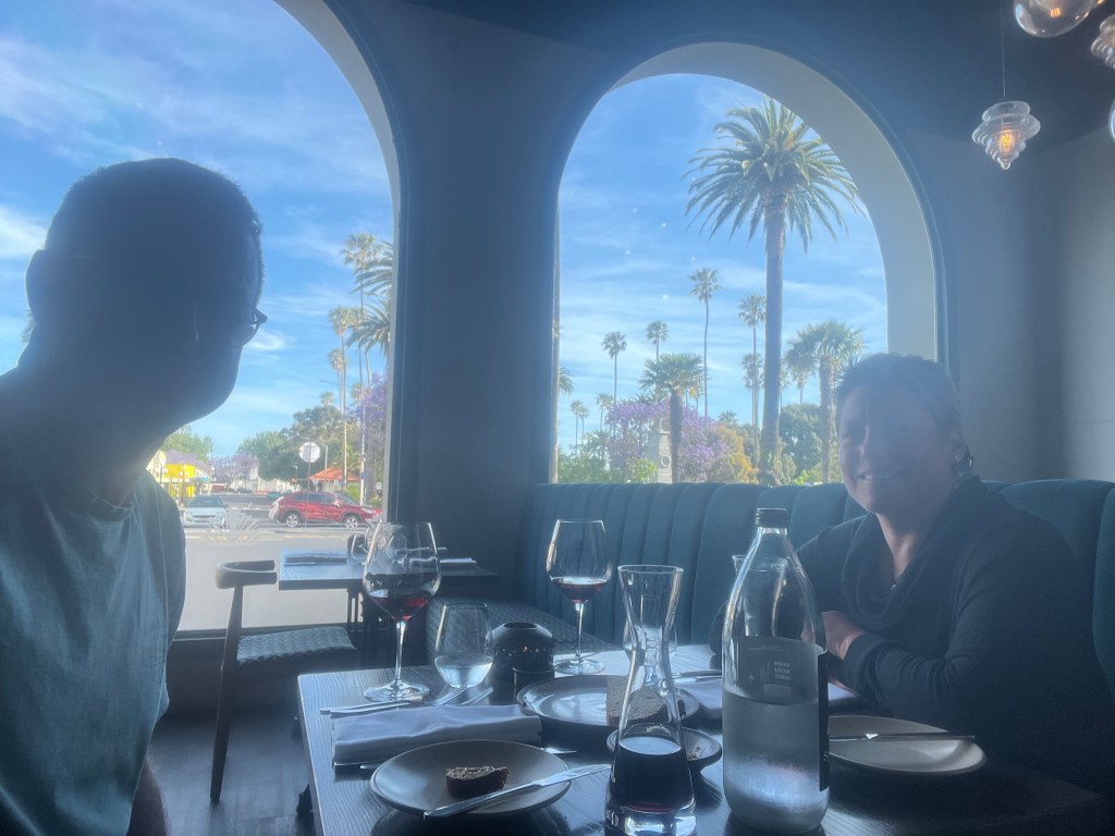 Sandy und ich nach unserem ride, auf den Kaffee wartend.