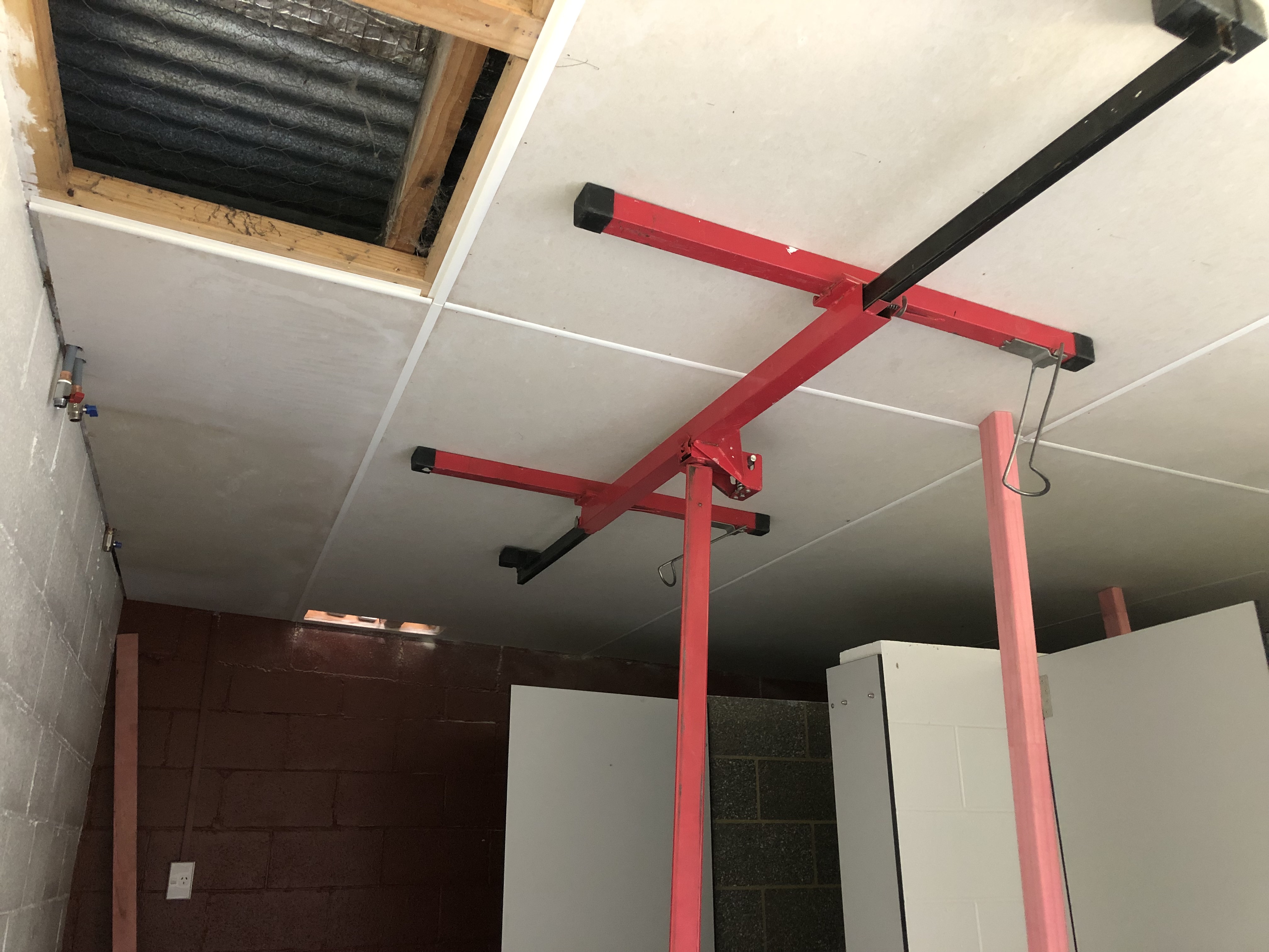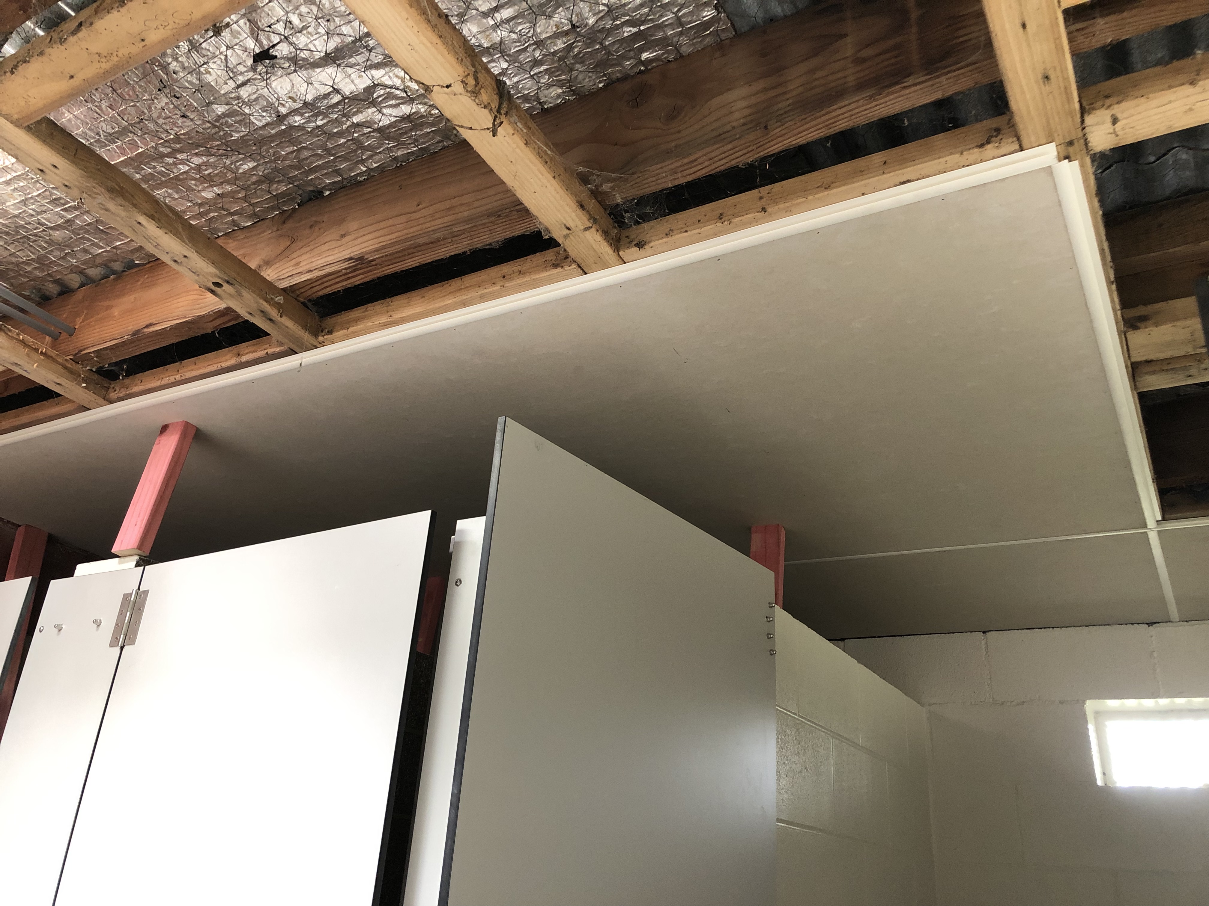 Die Bäder haben jetzt wieder eine Decke mit neuen Deckenstrahlern, die Decke muss nur noch gestrichen werden. Auf den Fotos seht ihr, wie die Platten gesetzt wurden und dann wie es jetzt aussieht: