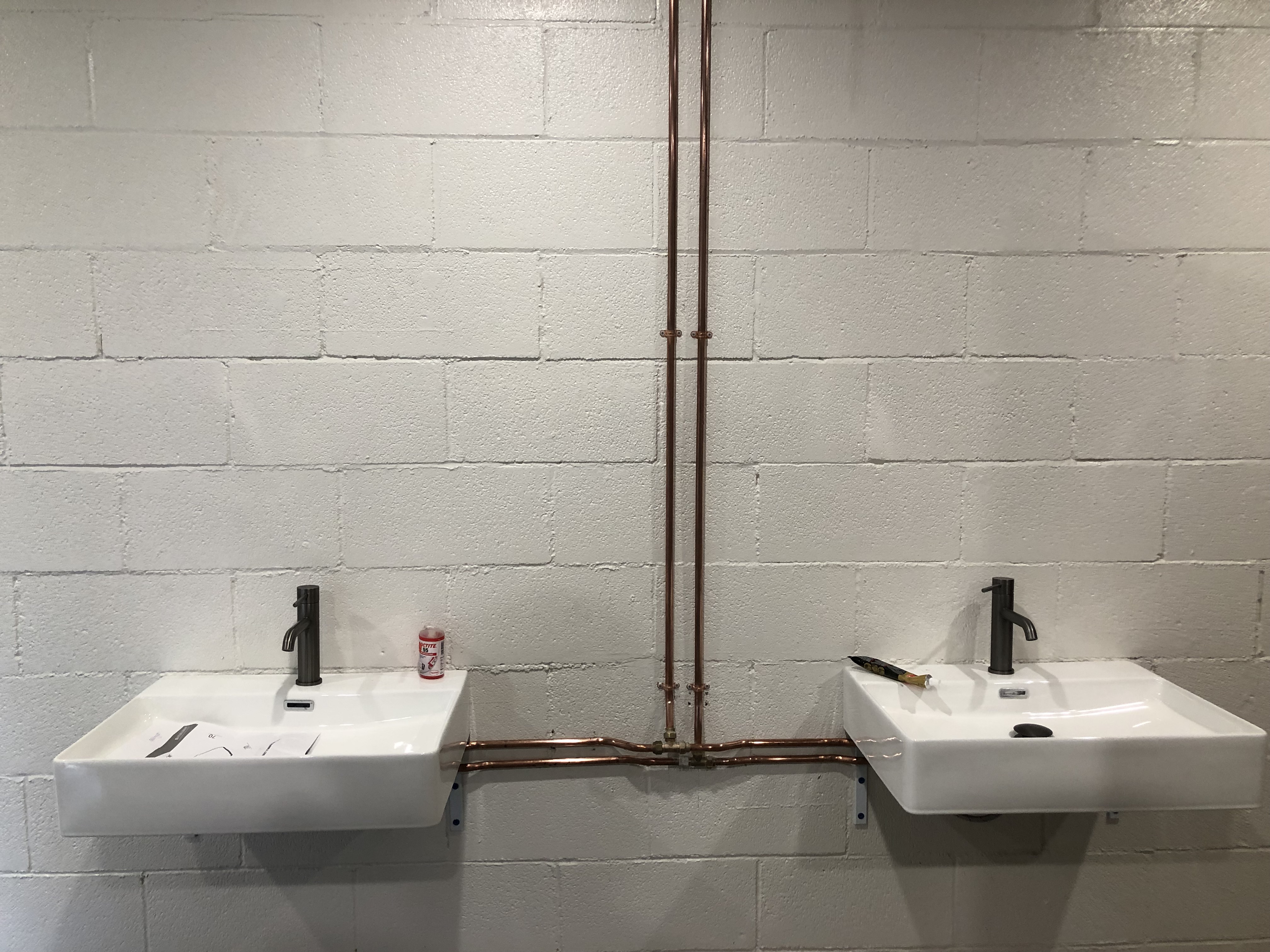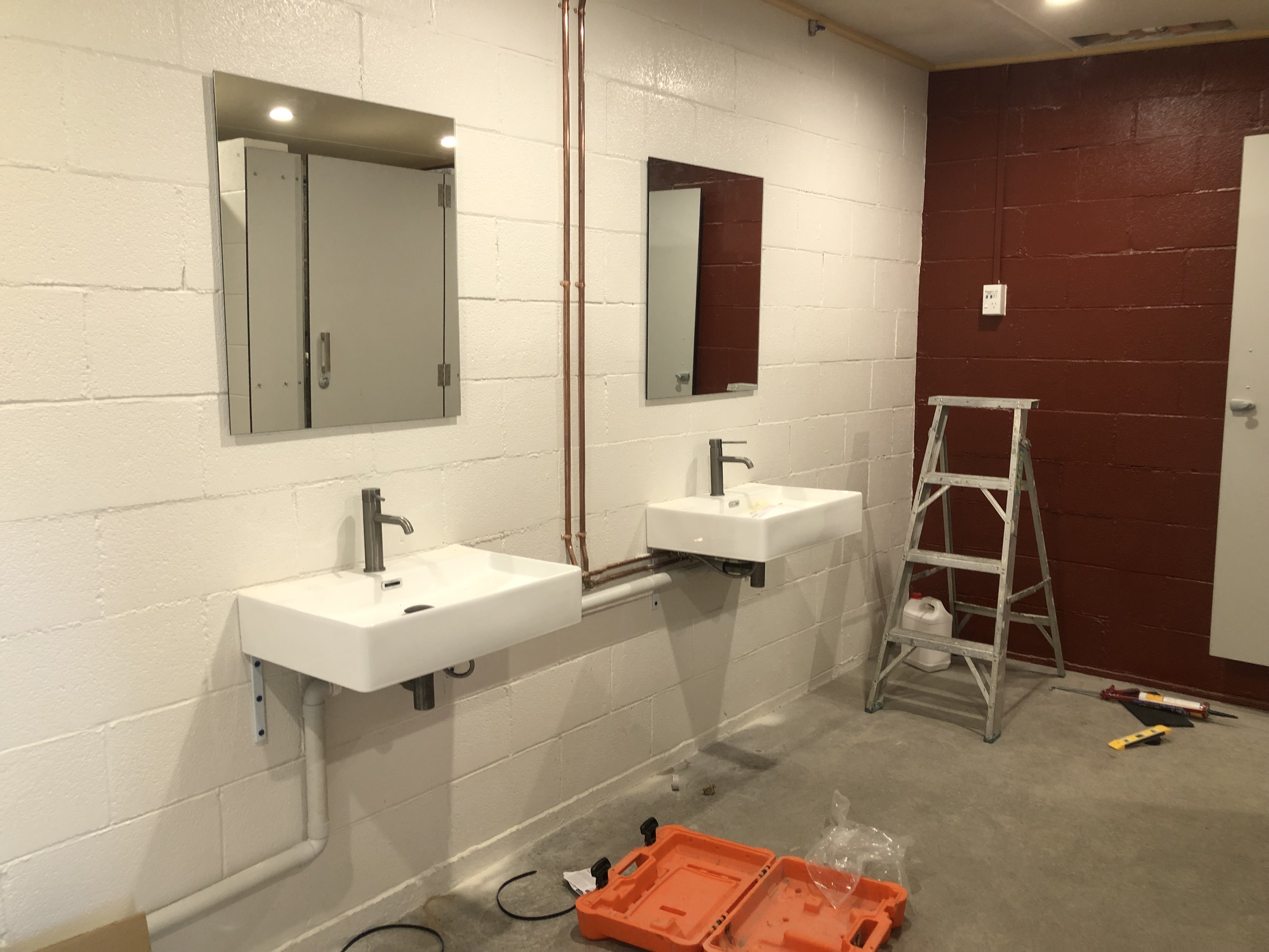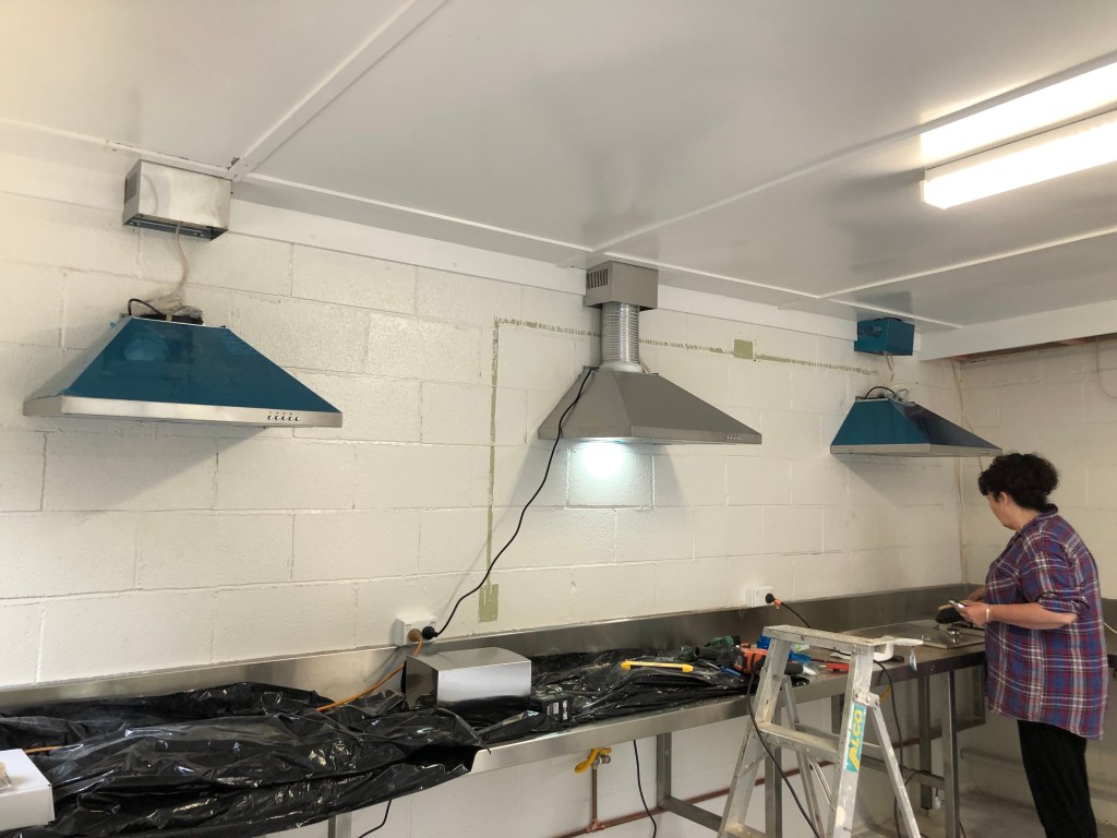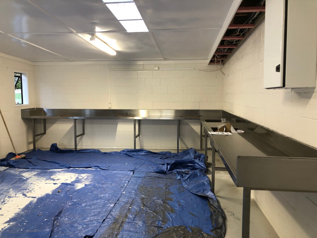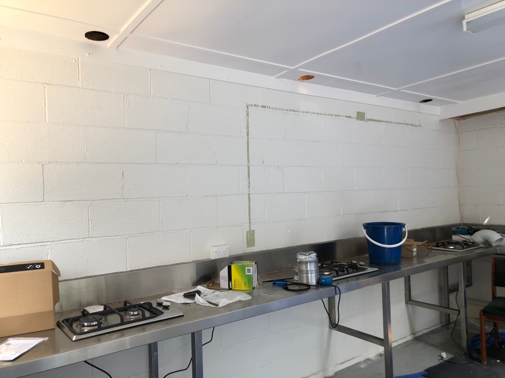 Der neue Sicherungskasten und die neuen Steckdosen für die Kühlschränke.Paddy’s Klempnerarbeiten für das heiße Wasser in der Küche.