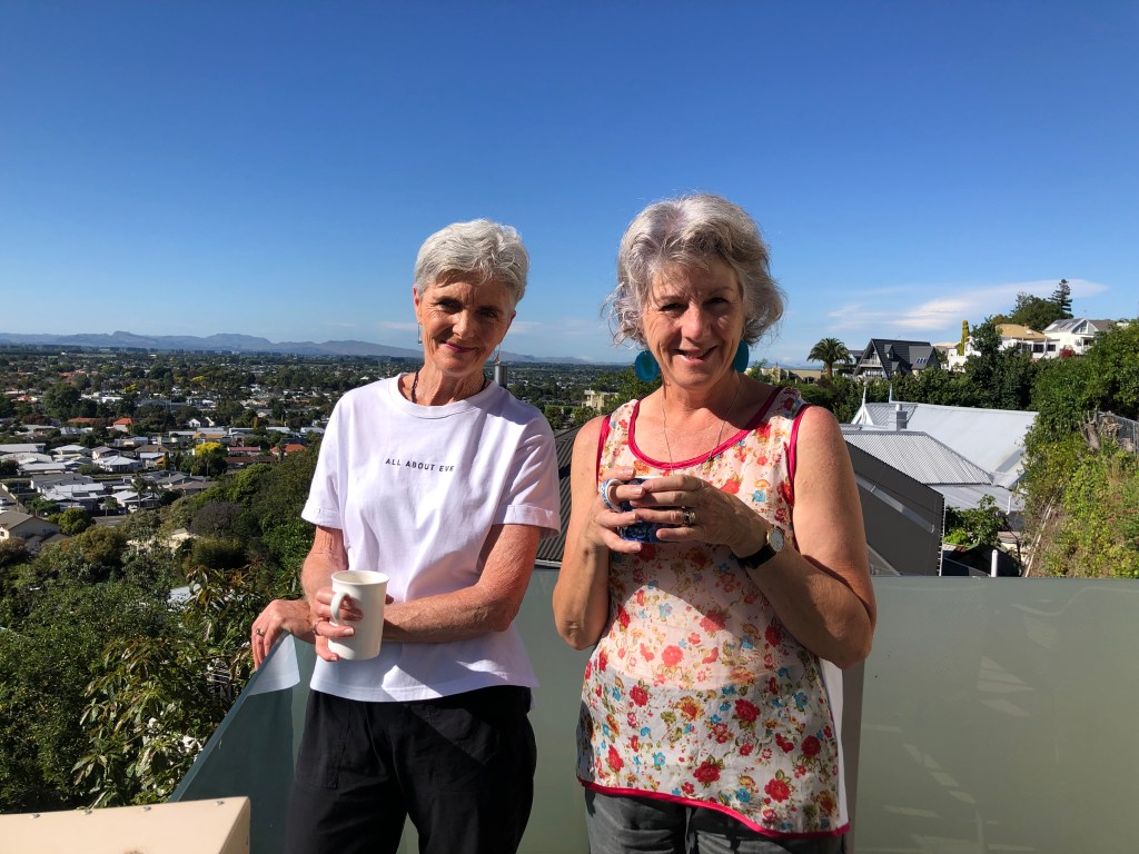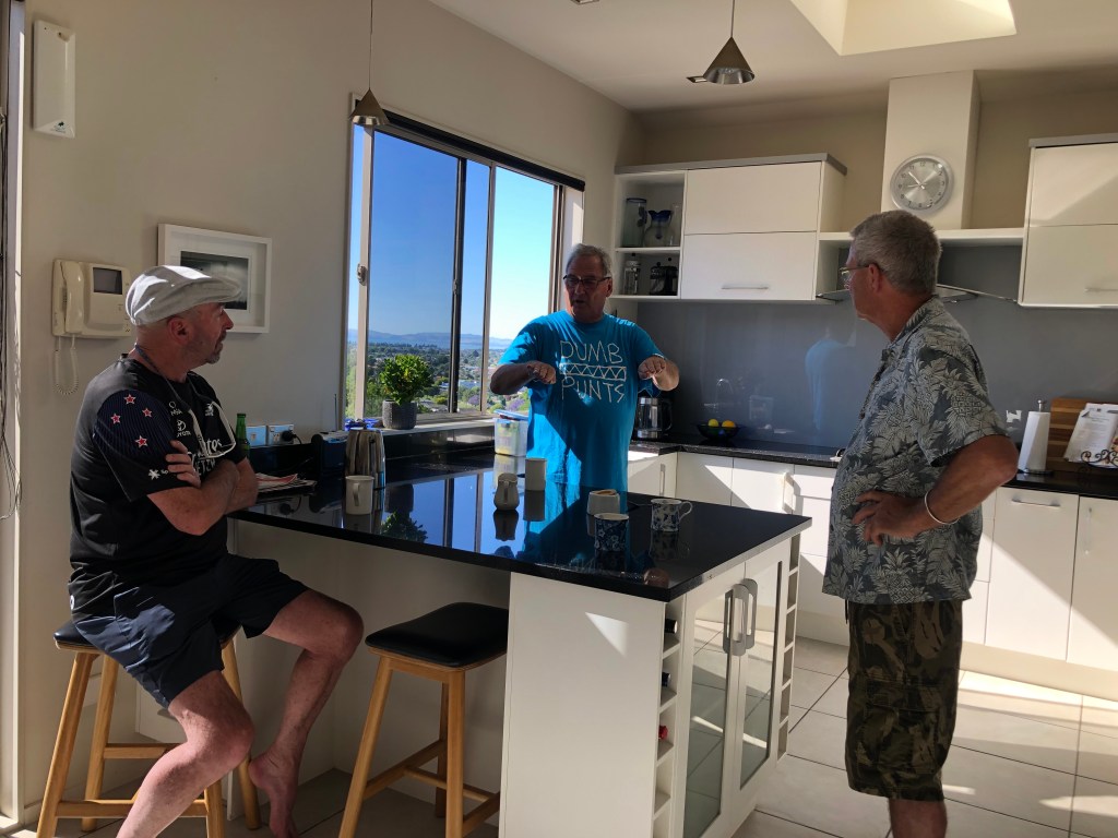Paddy auf der Veranda im untersten Stock, wo das AirB&B ist, und Baz ein Stockwerk darüber, wo sich ihre Wohnung befindet.Jane und Baz, unsere Gastgeber und langjährige Freunde von Paddy.Mit dem Blick von der Terrasse kann man schon leben, oder?!Jane und Heather mit dem ersten Kaffee des Tages, der nach der Party auch dringend nötig war.Bryn, Baz und Paddy in der Küche beim Kaffeekochen.