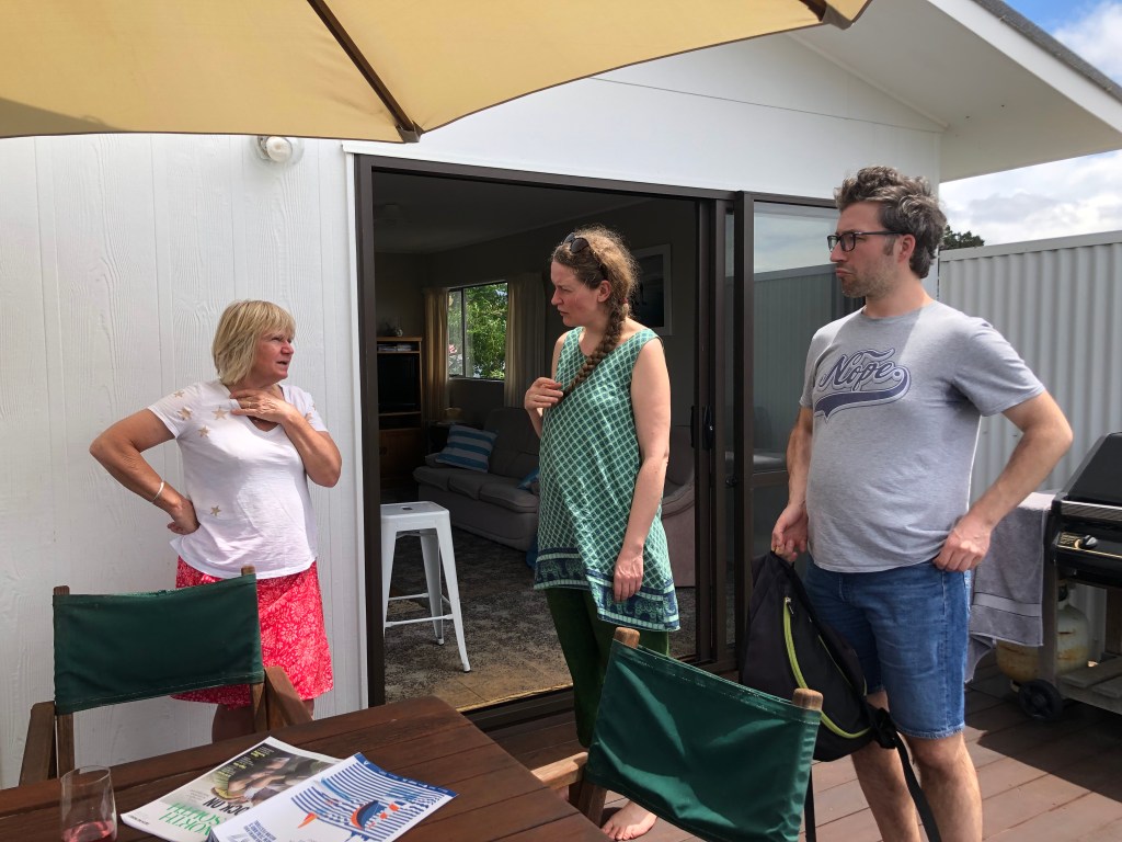 Anne und die erste Fahrt auf neuseeländischen Straßen in diesem Urlaub. Sandy mit Anne und Chris in ihrem Strandhaus.Sandy’s Balkon mit toller Aussicht bis zum Meer.