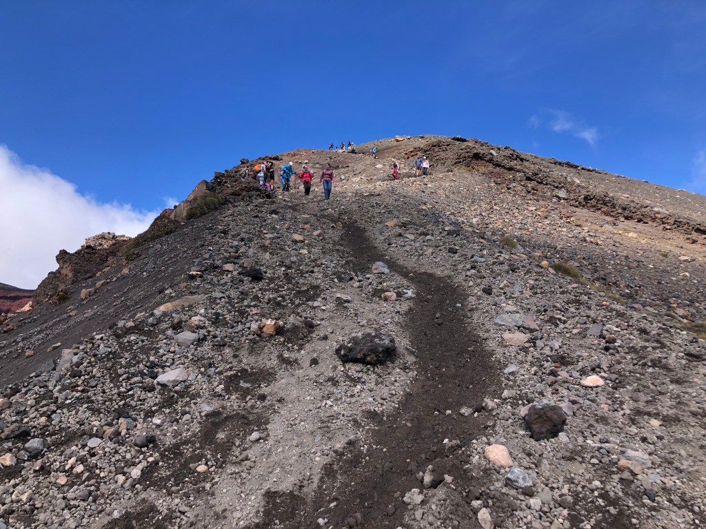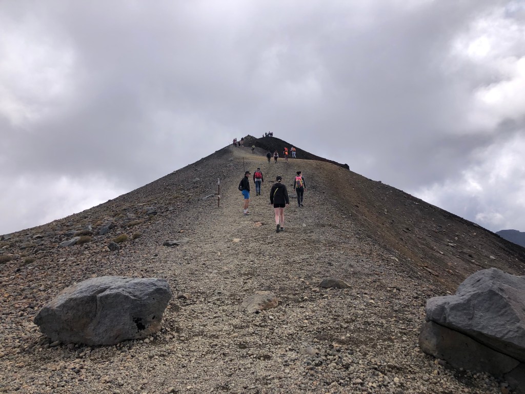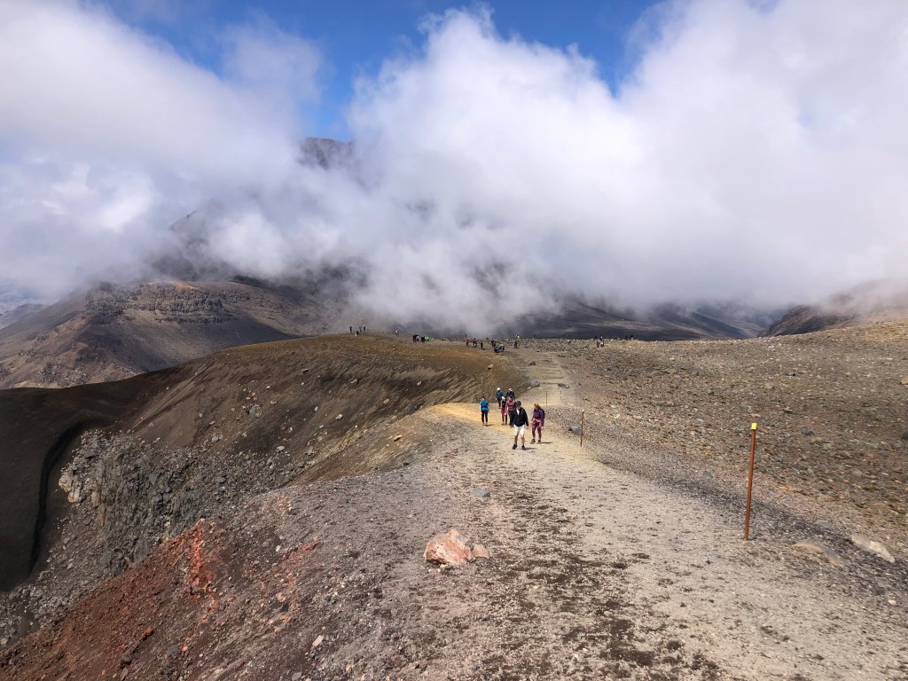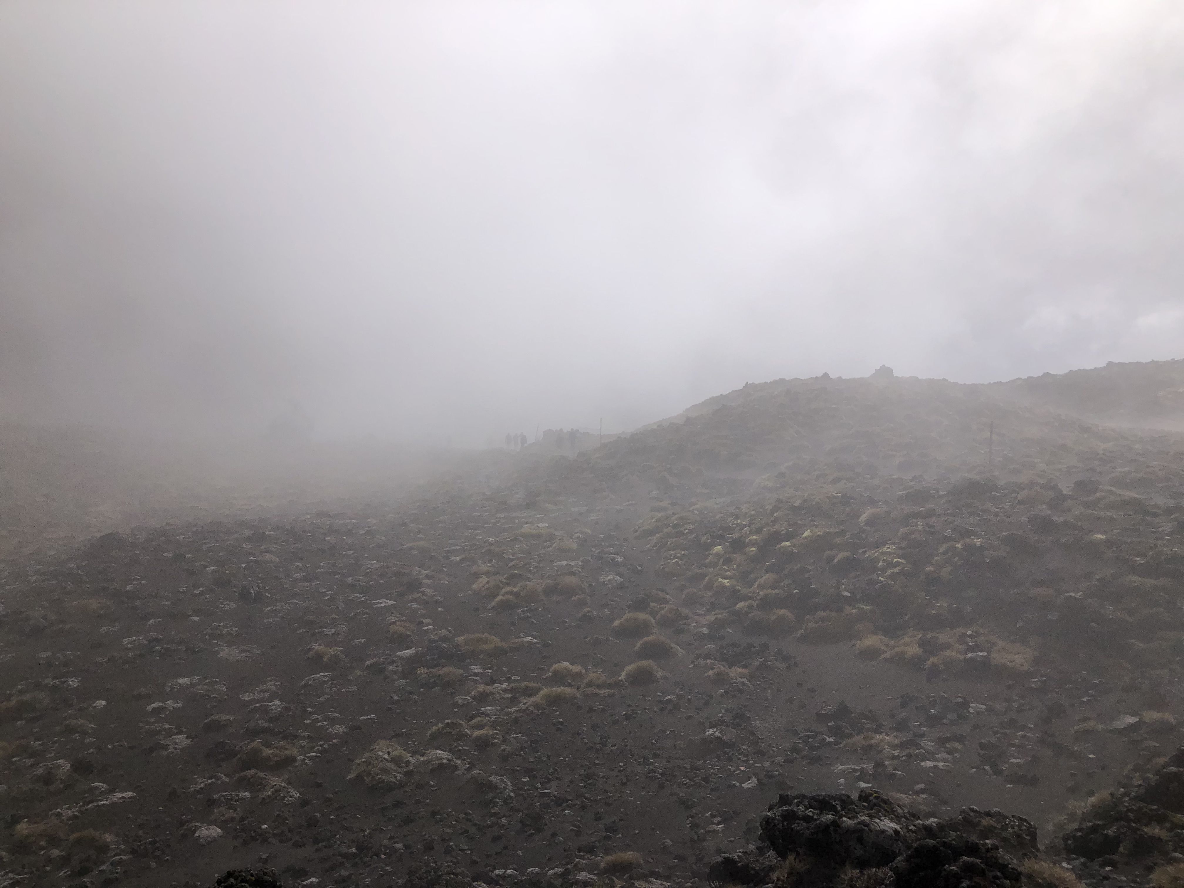 Fast oben am Plateau des South Craters angekommen, und es klarte etwas auf.Hin und wieder gab es einen Fetzen blauen Himmel und die Sonne kam heraus.Ausblick vom South Crater, bevor es hinauf zum Red Crater ging. Der letzte große Anstieg hinauf zum Red Crater.Der Red Crater – an irgendetwas erinnert mich das… 😉Die Sonne kam heraus! Und endlich konnte man auch den Schicksalsberg im Hintergrund sehen!Fast wie eine Mondlandschaft!