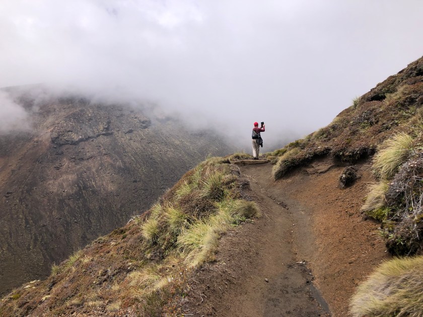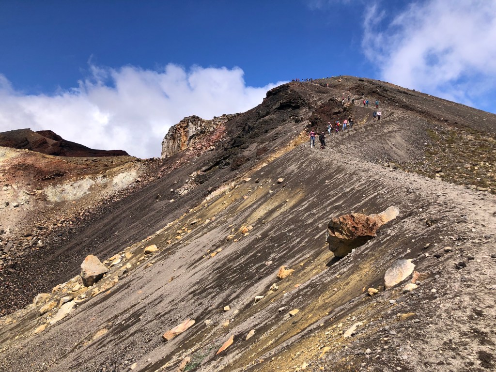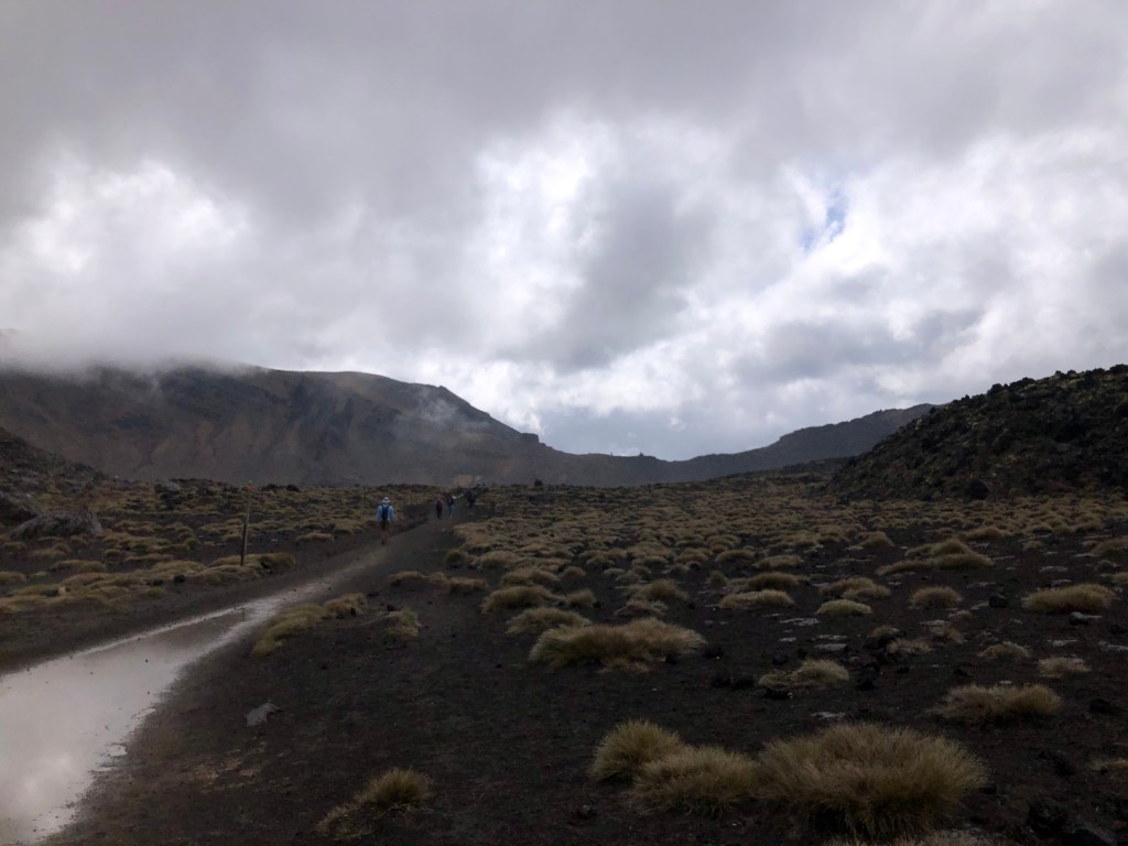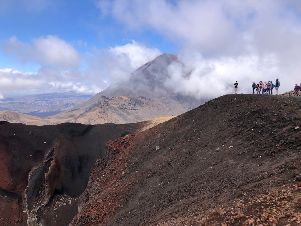 Fast oben am Plateau des South Craters angekommen, und es klarte etwas auf.Hin und wieder gab es einen Fetzen blauen Himmel und die Sonne kam heraus.Ausblick vom South Crater, bevor es hinauf zum Red Crater ging. Der letzte große Anstieg hinauf zum Red Crater.Der Red Crater – an irgendetwas erinnert mich das… 😉Die Sonne kam heraus! Und endlich konnte man auch den Schicksalsberg im Hintergrund sehen!Fast wie eine Mondlandschaft!