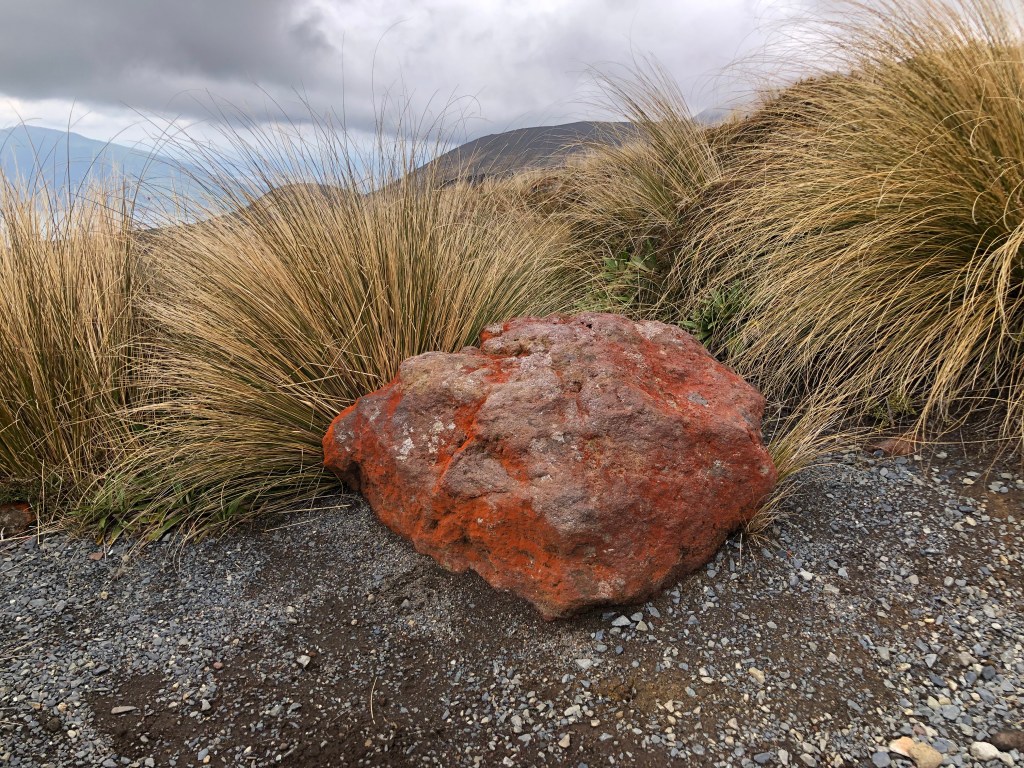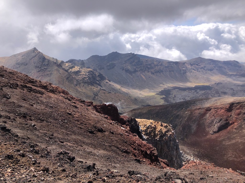 Vom Rand des Red Crater ging es, anfangs relativ steil und im Kies rutschig, hinab zu den Kraterseen. Es war das erste Mal, dass ich diese auch sehen konnte, 2019 war alles in Wolken gehüllt, man konnte die Seen nicht einmal erahnen. Umso besser konnte man sie heute bewundern! Nach dem steilen Abstieg gönnten wir uns eine Pause, um uns an unserem mitgebrachten Lunch zu stärken und die Aussicht zu genießen. In der Sonne und etwas windgeschützt wurde es auch ein bisschen wärmer, oben auf dem Vulkan war es ziemlich kühl gewesen.