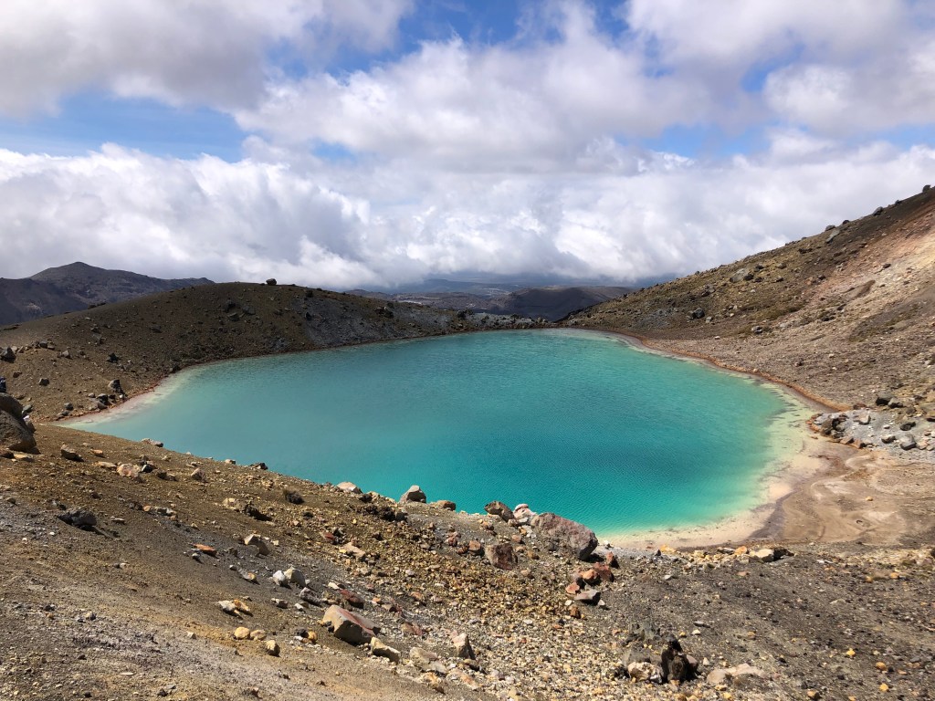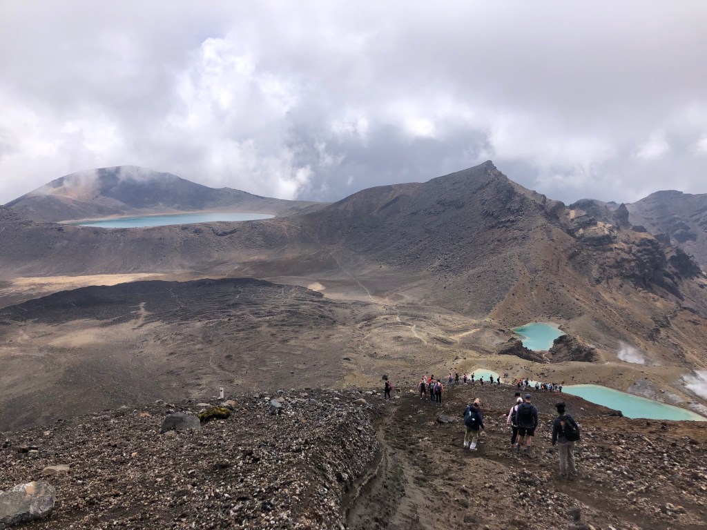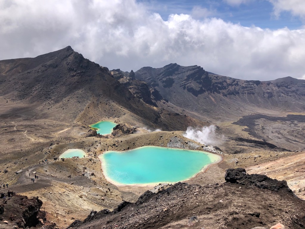 Die Kraterseen von oben auf einen Blick – links der Blue Lake, rechts die Emerald Lakes.Die Emerald Lakes – was für eine krasse Farbe in dem sonst ziemlich eintönigen Braun.So steil ging es vom Vulkan hinunter zu den Seen.Hier nochmal aus einer etwas anderen Perspektive.Unser „Pausensee“, der größte der Emerald Lakes.Die drei hiking buddies – wir sehen aus wie eine Rockband auf einem Albumcover 😉