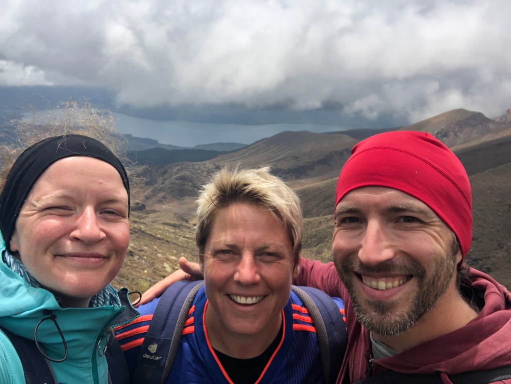 Gruppenbild vor toller Aussicht, auch wenn die Wolken tief über Lake Rotoairahingen.