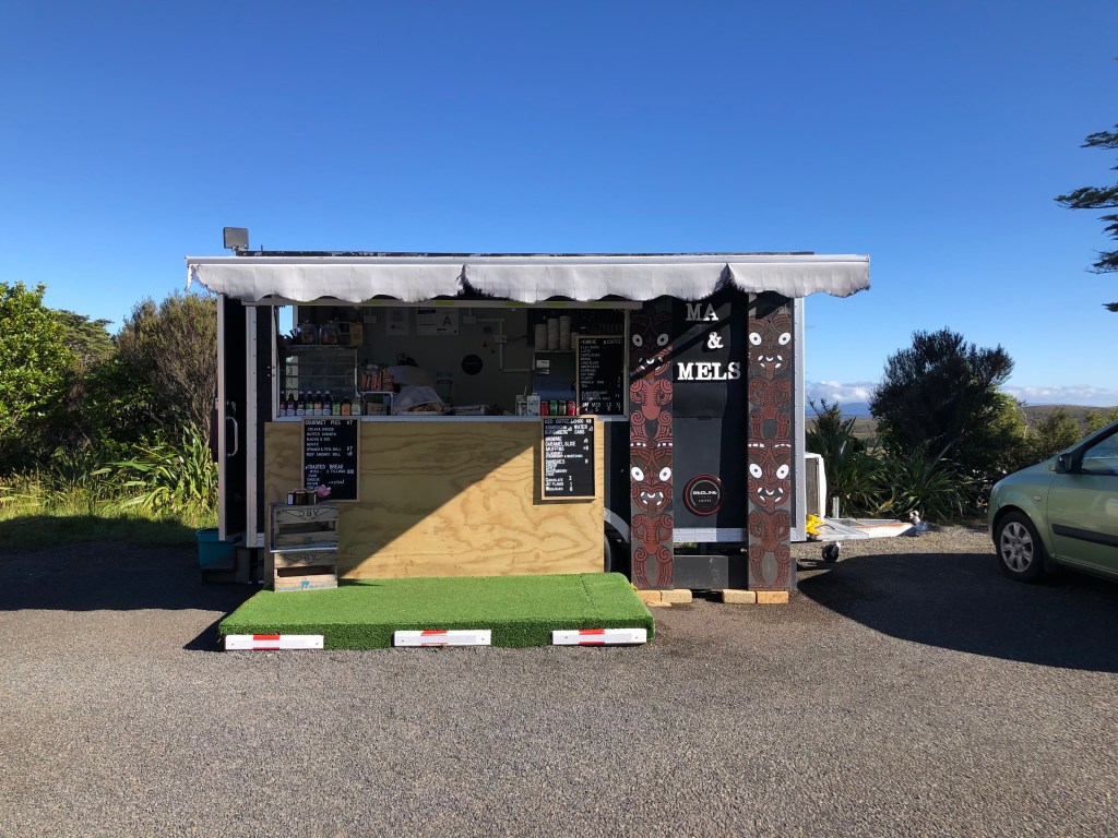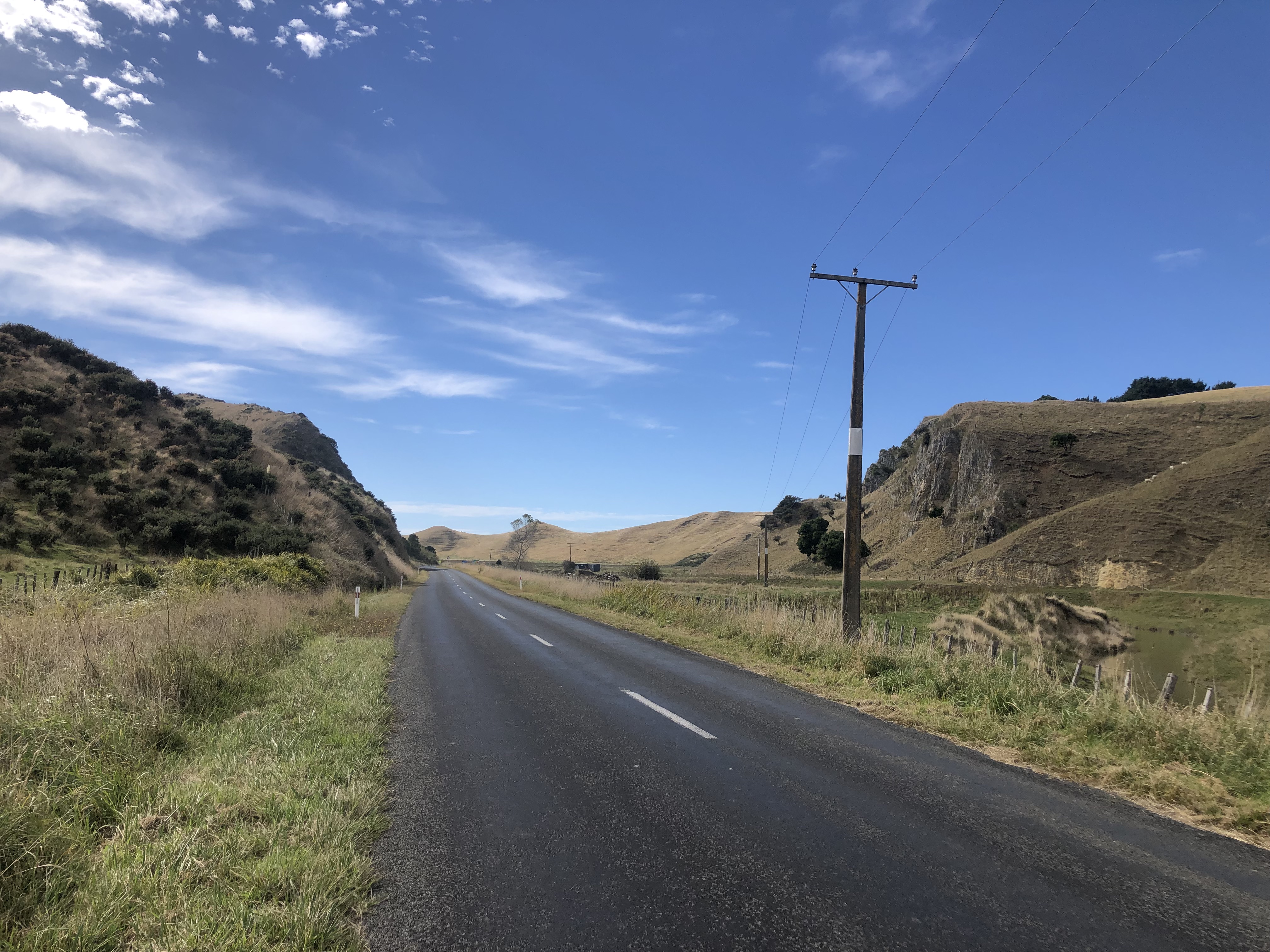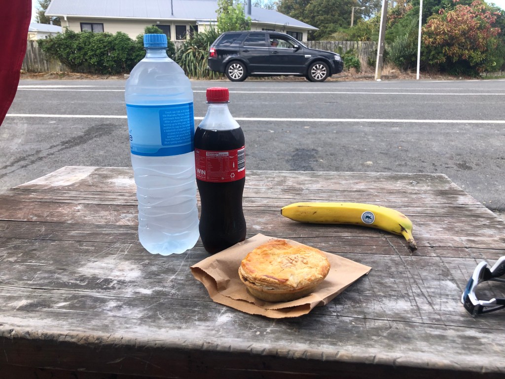 In Porangahau angekommen, gönnte ich mir ein leckeres Mittagessen, bestehend aus Pie, Banane und Cola, bevor es frisch gestärkt auf die letzten 20 überwiegend flachen Kilometer nach Blackhead Beach ging.
