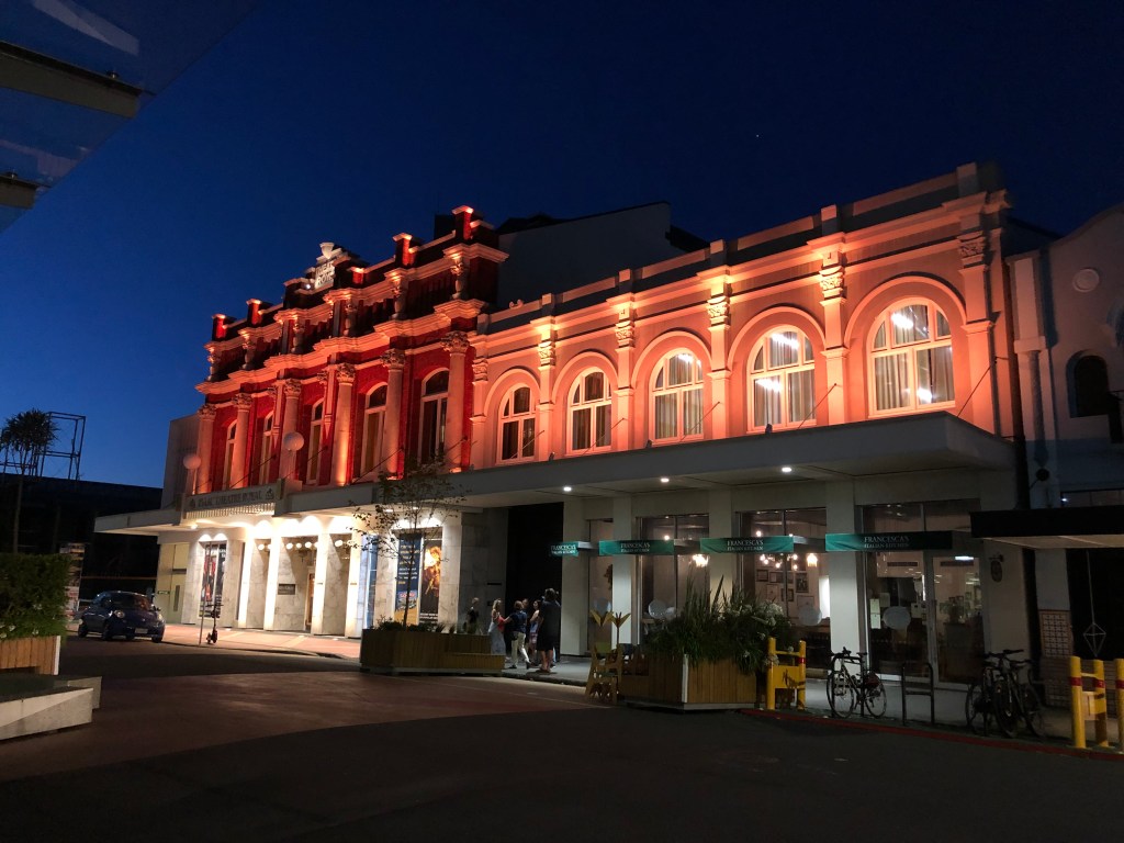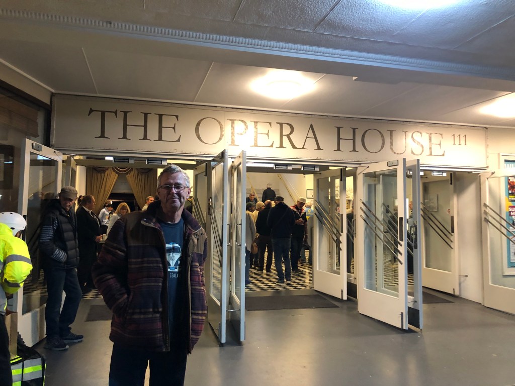 Nur einen Tag später fuhren Paddy und ich für ein Wochenende nach Wellington – ich hatte Paddy Karten für den weltbekannten Gitarristen Tommy Emmanuel zum Geburtstag geschenkt, und wir verbanden das mit einem ganzen Wochenende in der Hauptstadt. Wir checkten in unserem Lieblings-AirBnB in Aro Valley ein und machten uns zu Fuß auf den Weg zum Opera House in der Innenstadt, wo das Konzert stattfand. Es war der Hammer! Ich verstehe zwar nicht viel vom Gitarrespielen, aber selbst ich als Laie konnte sehen, dass der Typ der Wahnsinn war! Leider habe ich keine Fotos oder Videos vom Konzert gemacht, nur davor: