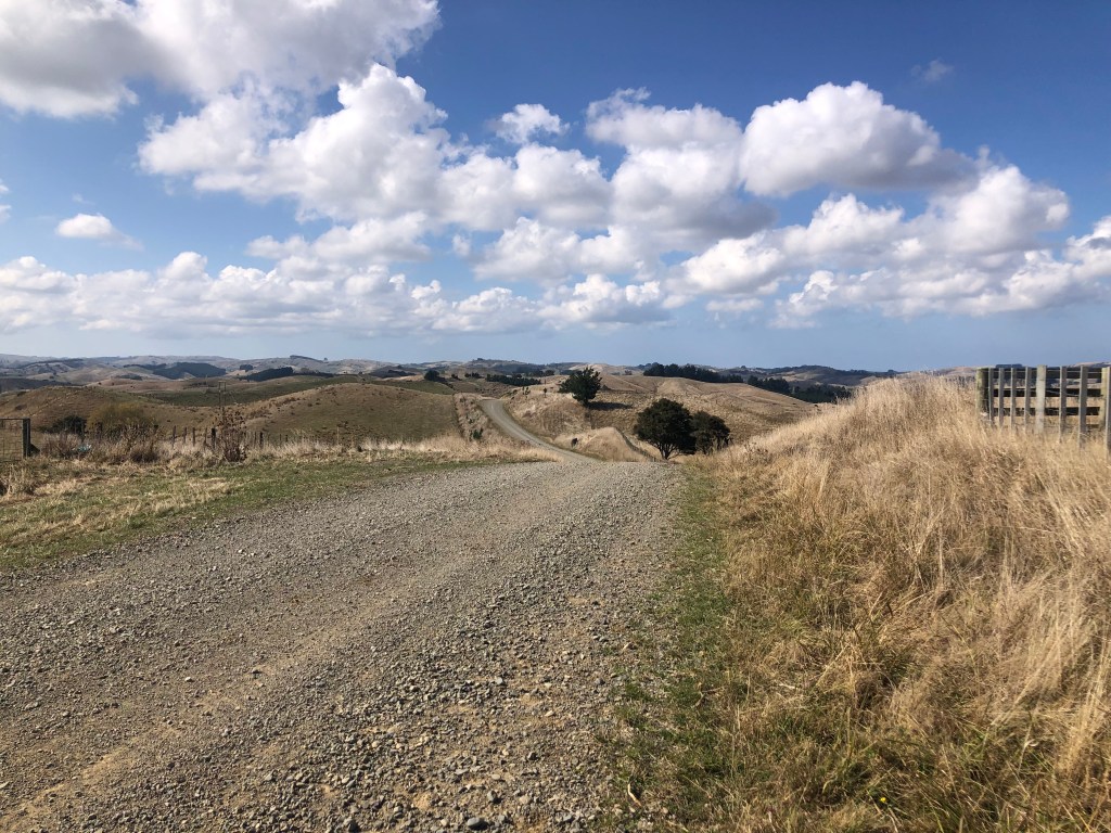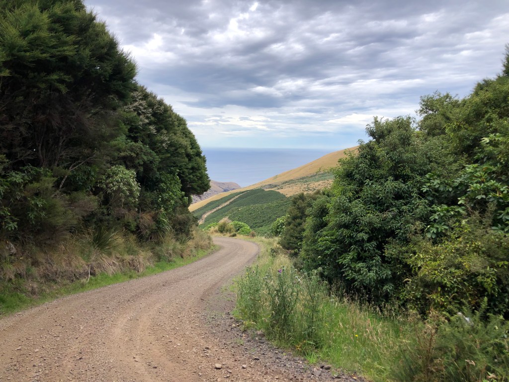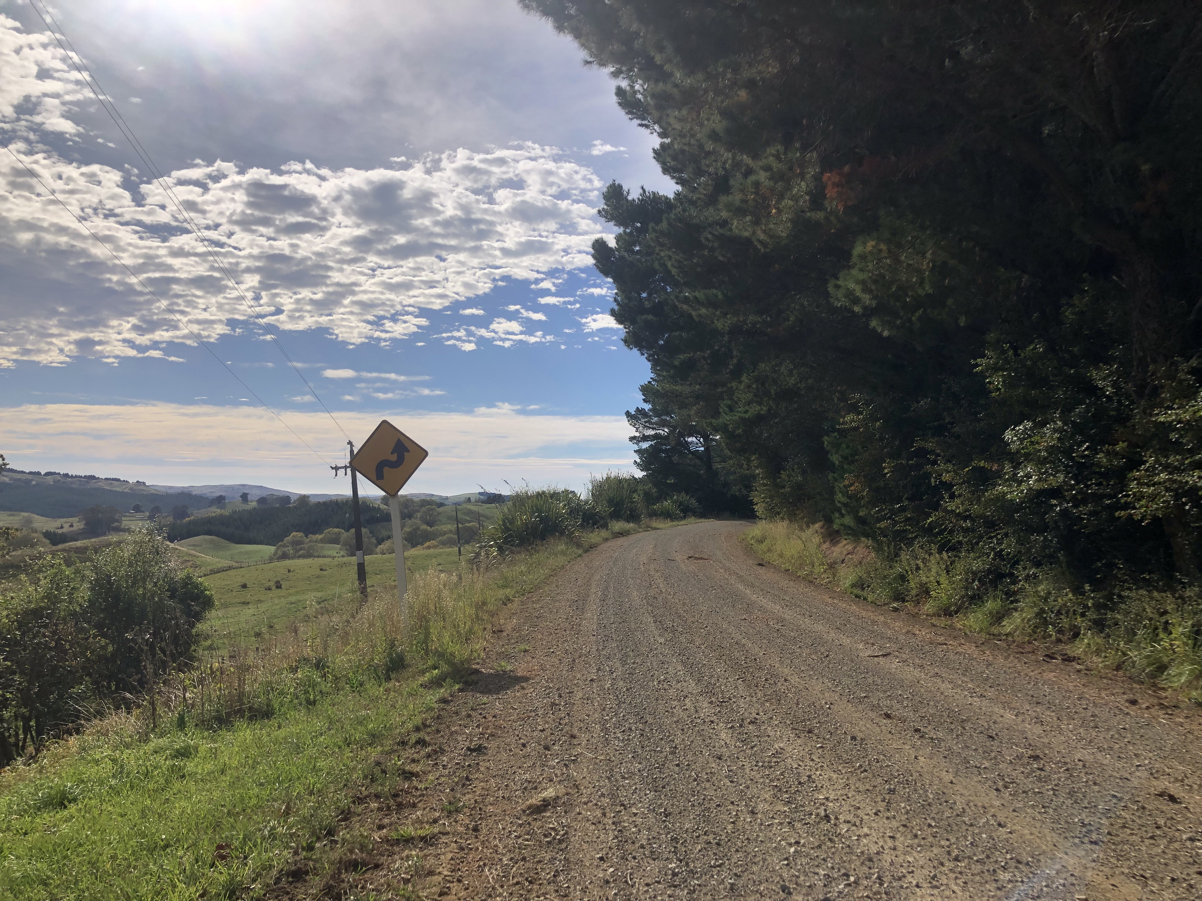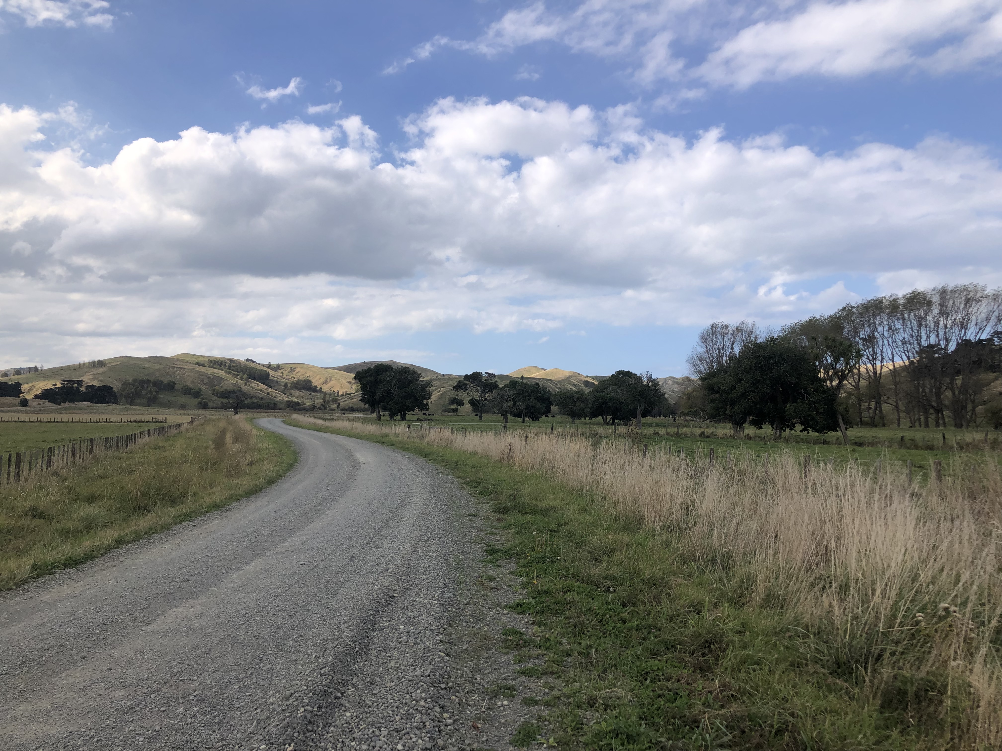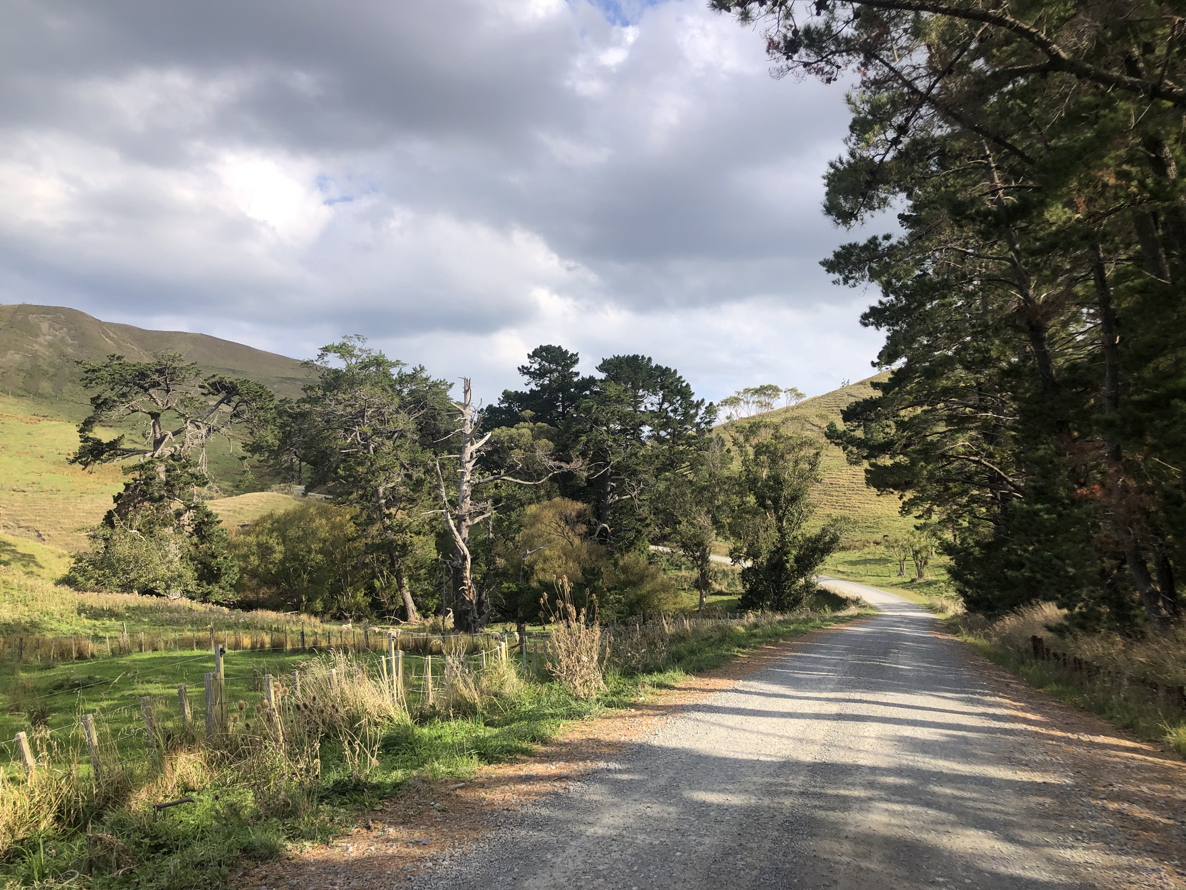 Nach diesem traumhaften (und leichten) Teil meiner Radtour ging es von Pourerere aus ein paar Kilometer bergauf, aber wenigstens auf asphaltierter Straße, und meine Beine waren zum Glück überraschend gut. Oben angekommen, genoss ich einen kurzen Downhill-Abschnitt, bevor es rechts ab auf die Clareinch Road, einer Schotterstraße zur Kairakau Beach, weiter ging. Die ersten paar Kilometer waren nicht schön zu fahren, da der Schotter sehr tief war, aber das wurde glücklicherweise nach ca 8km besser, und so konnte ich die wunderschöne Landschaft genießen, denn nun musste ich mich nicht mehr so sehr aufs Fahren und Nicht-Ausrutschen konzentrieren: