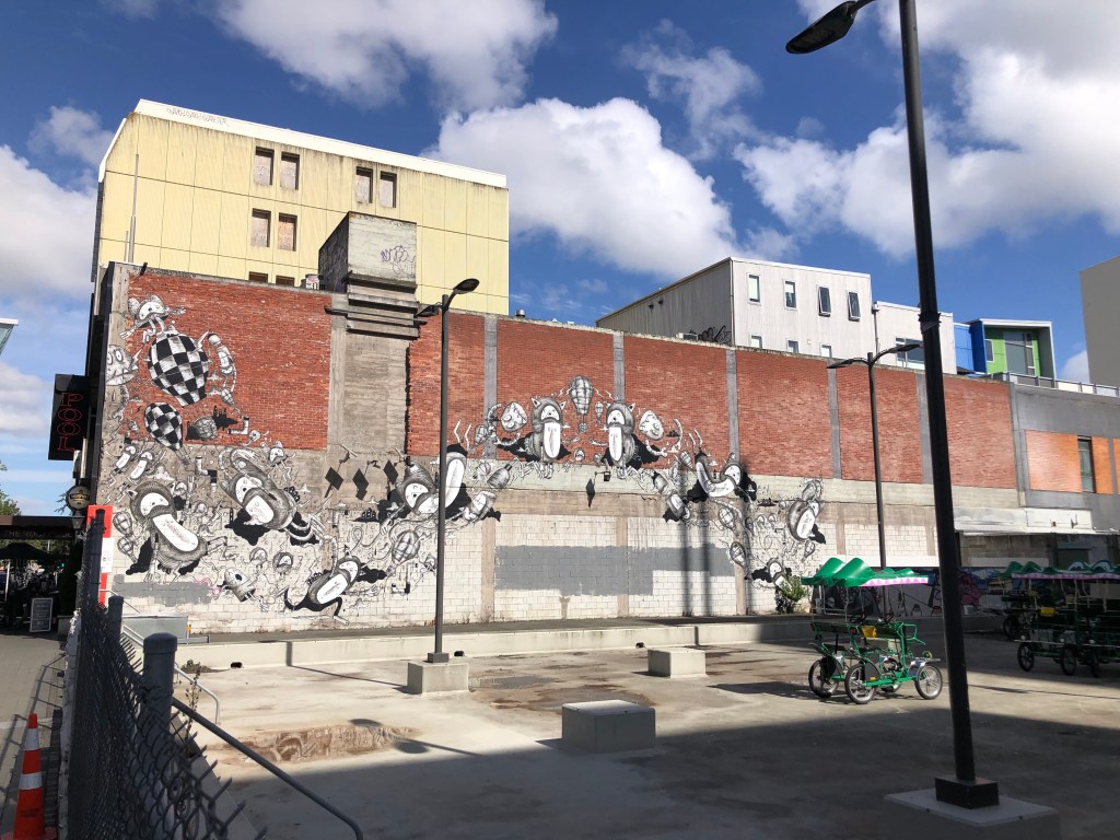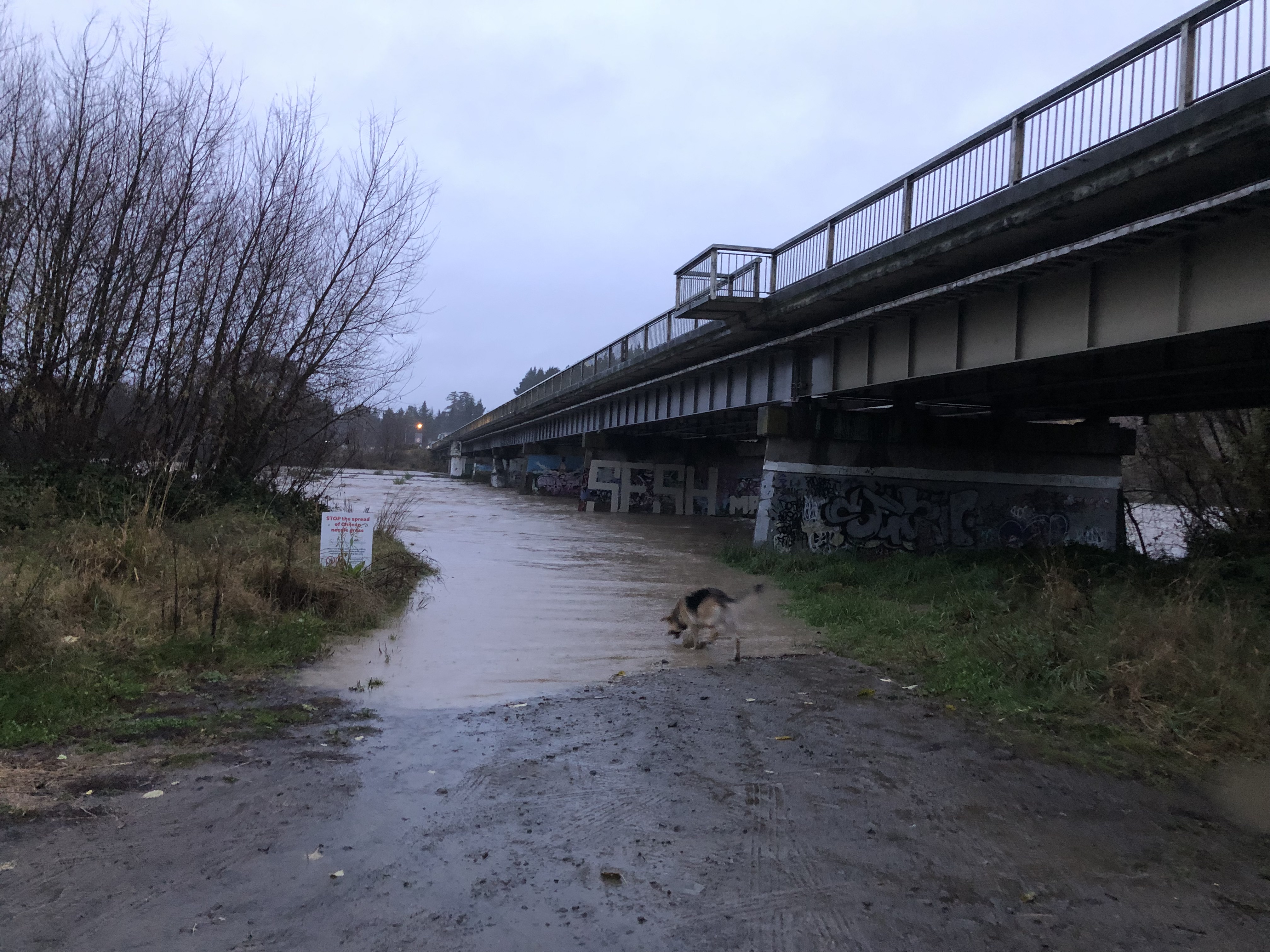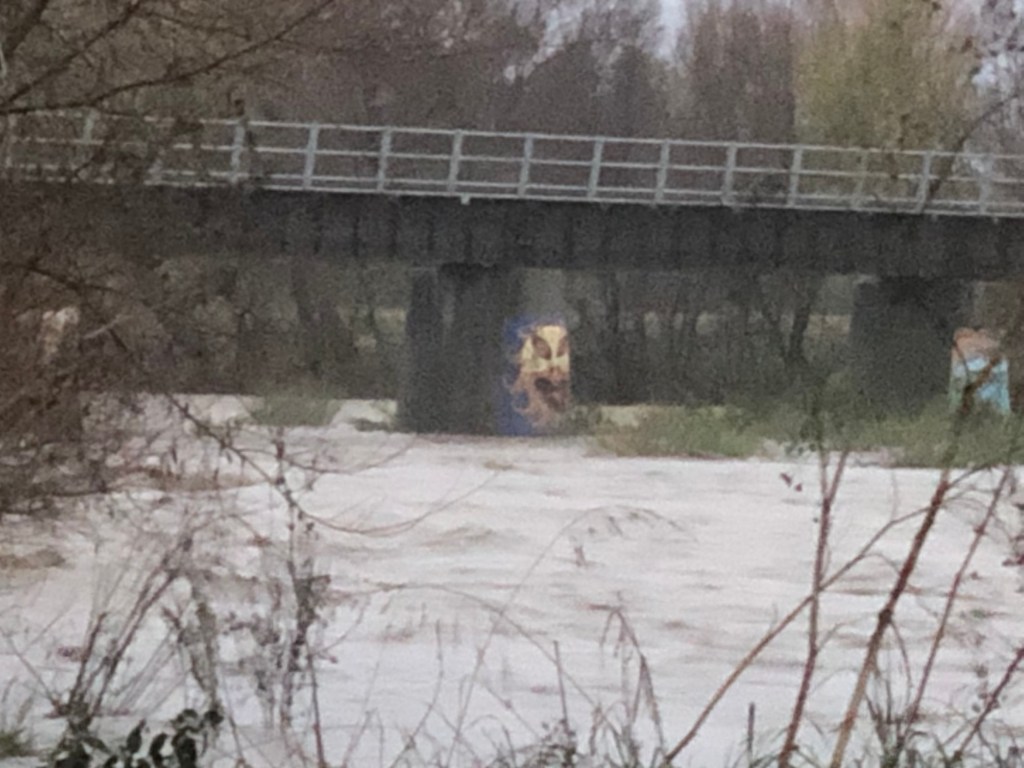 Vor ein paar Wochen hatten wir zwei Tage Starkregen, so dass der Fluss ziemlich anstieg, aber zum Glück war er weit entfernt davon, eine Überschwemmung wie letztes Jahr zu verursachen. Um einzuschätzen, wie hoch der Wasserstand ist, schauen wir auf das Monstergesicht, das jemand auf einen der Brückenpfeiler gemalt hat – wenn das Wasser ihm in den Mund (oder gar die Augen) läuft, ist es ziemlich hoch. Dieses Mal war es noch einiges davon entfernt: