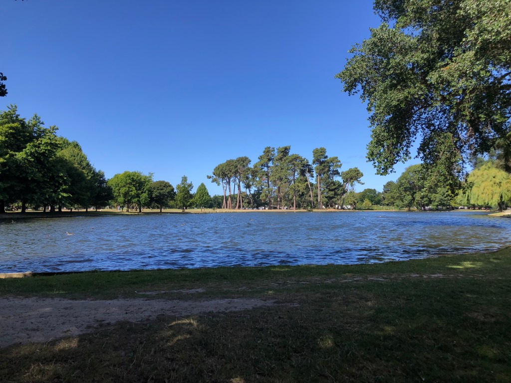 In Shorts und T-Shirt bei strahlendem Sonnenschein macht der Spaziergang am Fluss mit Harvey gleich viel mehr Spaß!