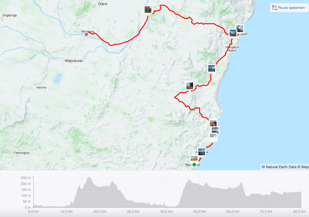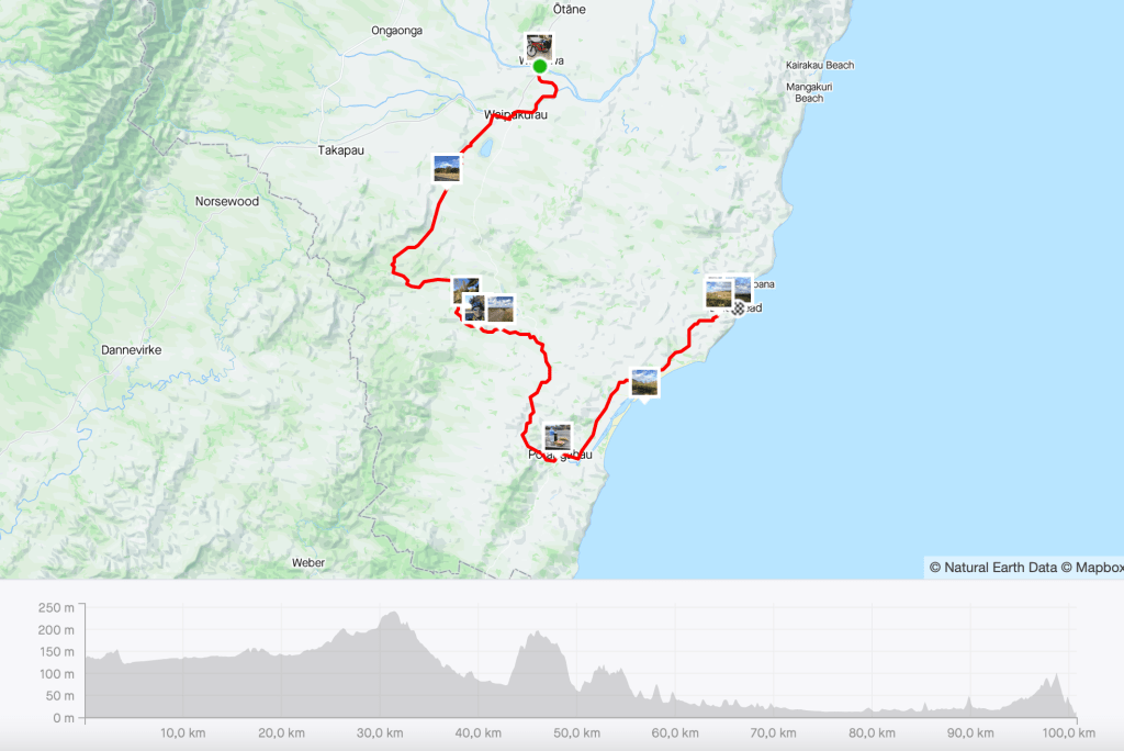 Der erste Tag führte mich von Waipawa nach Waipukurau und auf teils Schotter-, teils asphaltierten Straßen über Porangahau bis nach Blackhead Beach, 100km weit bei knapp 1000 Höhenmetern.