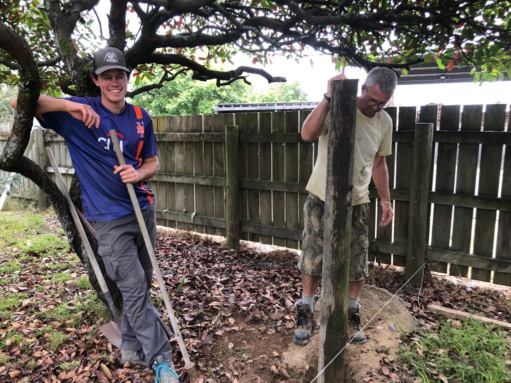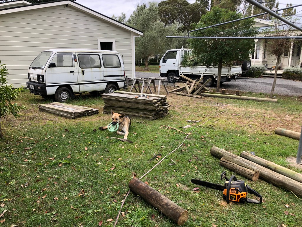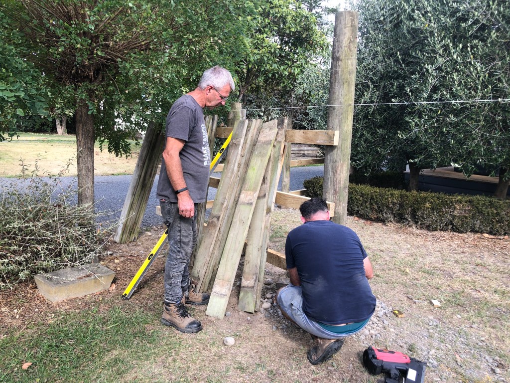 Netterweise half Thilo uns dann noch tatkräftig beim Zaunbau – wir mussten einen Zaun um unsere Lodge bauen, um Harvey davon abzuhalten, die Vanuatu-Boys aufzufressen, die noch bis August in der Lodge wohnen, während sie auf den Apfelplantagen arbeiten. Harvey mag es nicht, wenn fremde Leute auf unserem Grundstück sind, und leider scheint er zusätzlich rassistisch zu sein… jedenfalls bellt er die Jungs von den Inseln regelmäßig an, obwohl er sich inzwischen eigentlich an sie hätte gewöhnen müssen.