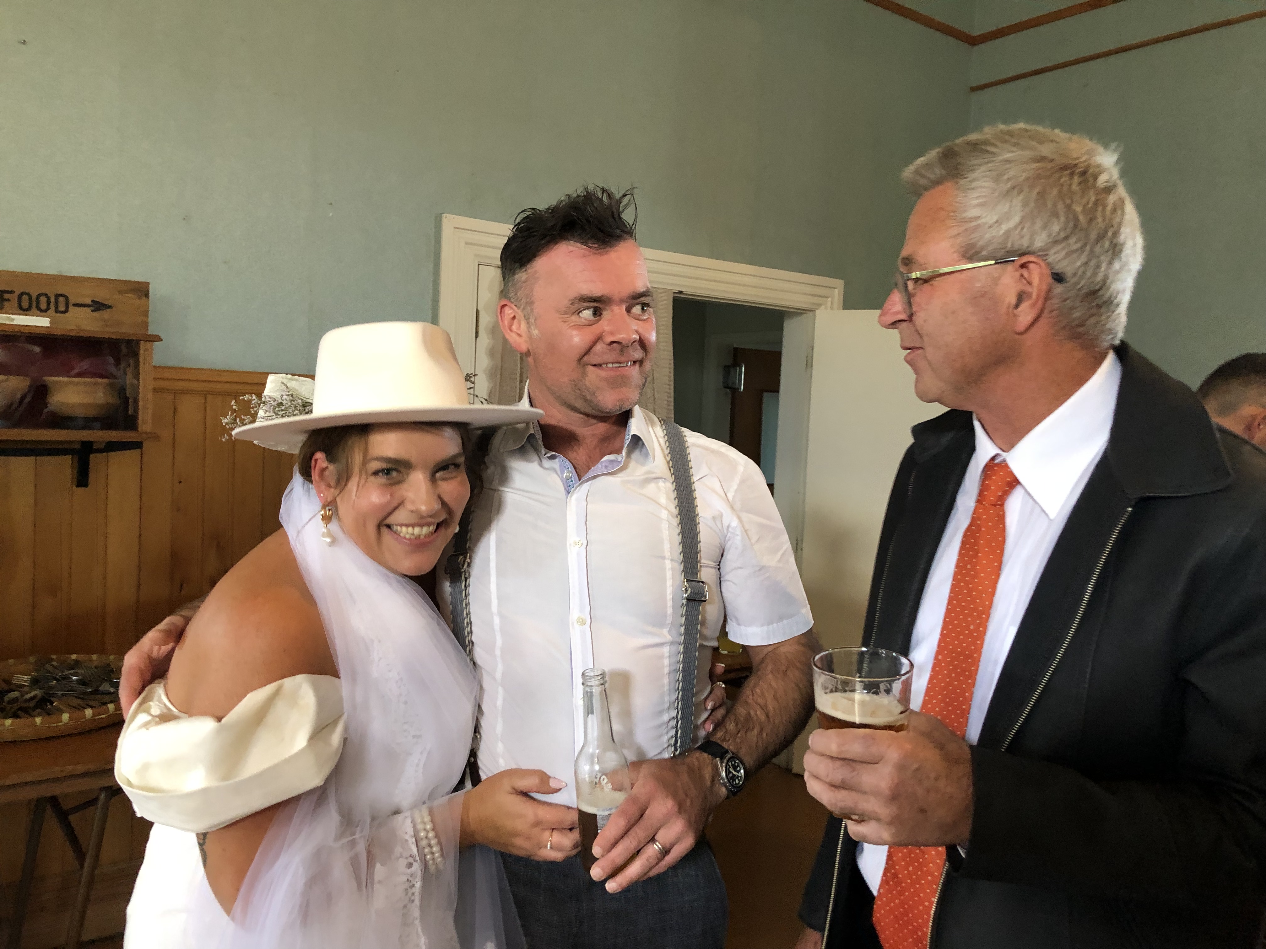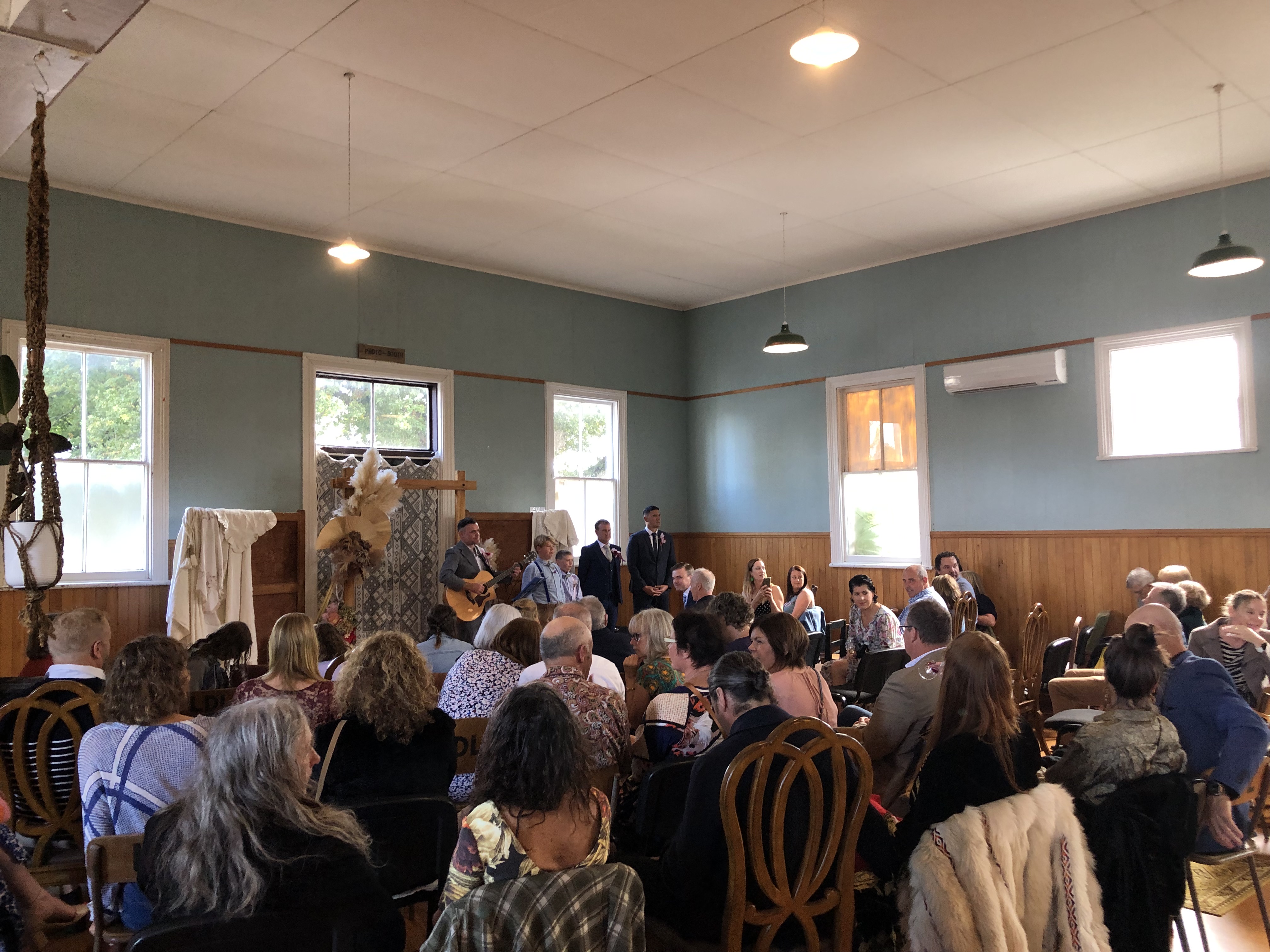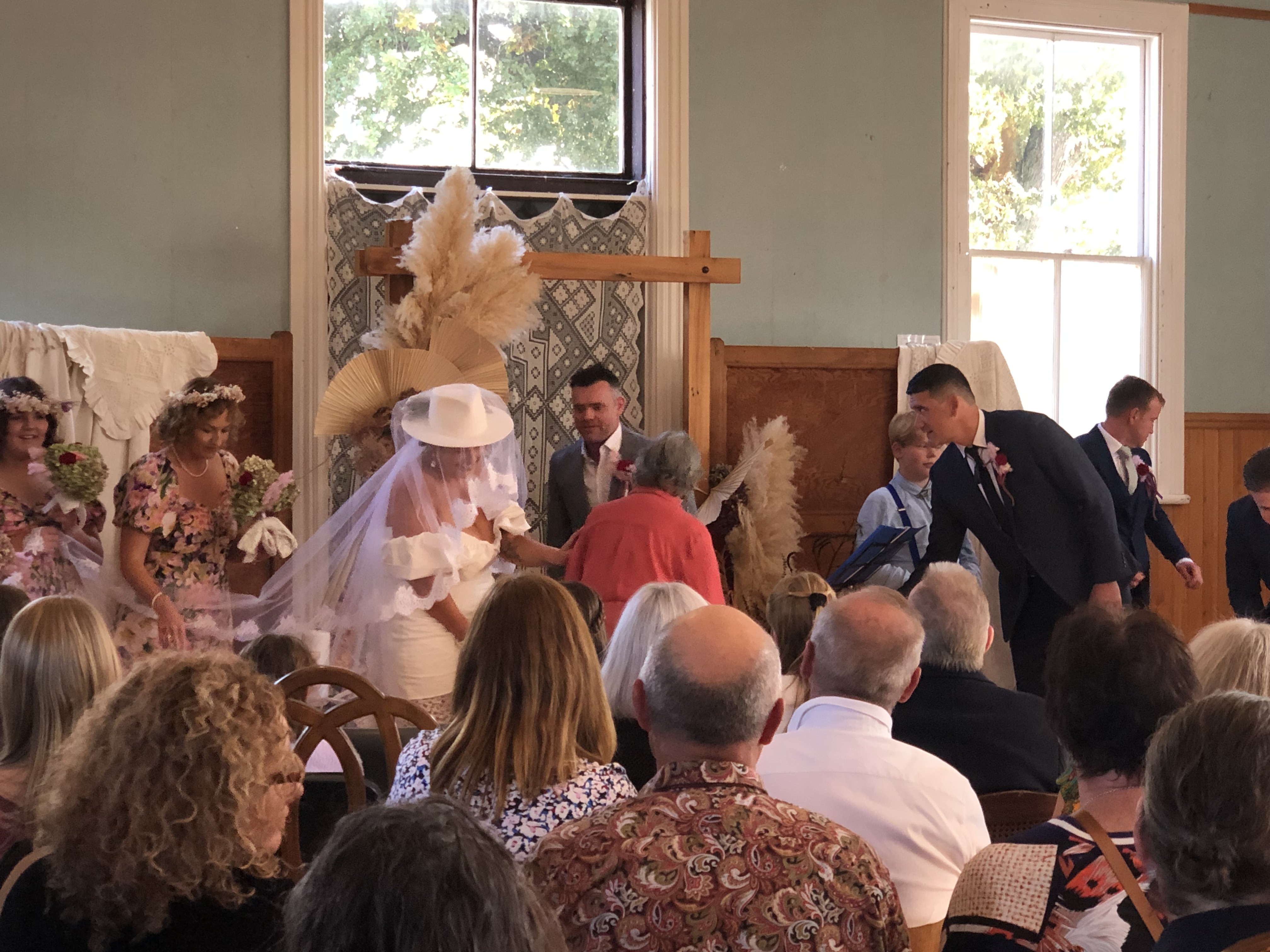 Am Osterwochenende fand Saritas und Harrys Hochzeit statt. Eigentlich war geplant gewesen, sie bei uns im Garten zu feiern, aber ausgerechnet an diesem Samstag spielte das Wetter nicht mit und es goß in Strömen (nach wochenlanger Dürre!). Zum Glück konnten die beiden ganz kurzfristig die Otane Town Hall buchen, und so fand die Hochzeit drinnen statt. Es war eine ganz zwanglose, schöne Feier, bei der auch die beiden Bands der Neuverheirateten spielten – beide sind Sänger in ihrer jeweiligen Band. Es war ein echt schönes Fest!