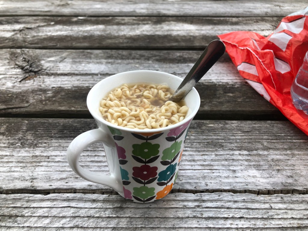 Ich genehmigte mir mein Abendessen (Fertignudeln, wie immer on tour) mit Blick auf den Strand und das Meer. Danach ging es früh ins Bett bzw. den Schlafsack, ich würde früh aufstehen müssen, um die Ebbe zu erwischen und über den Strand fahren zu können.
