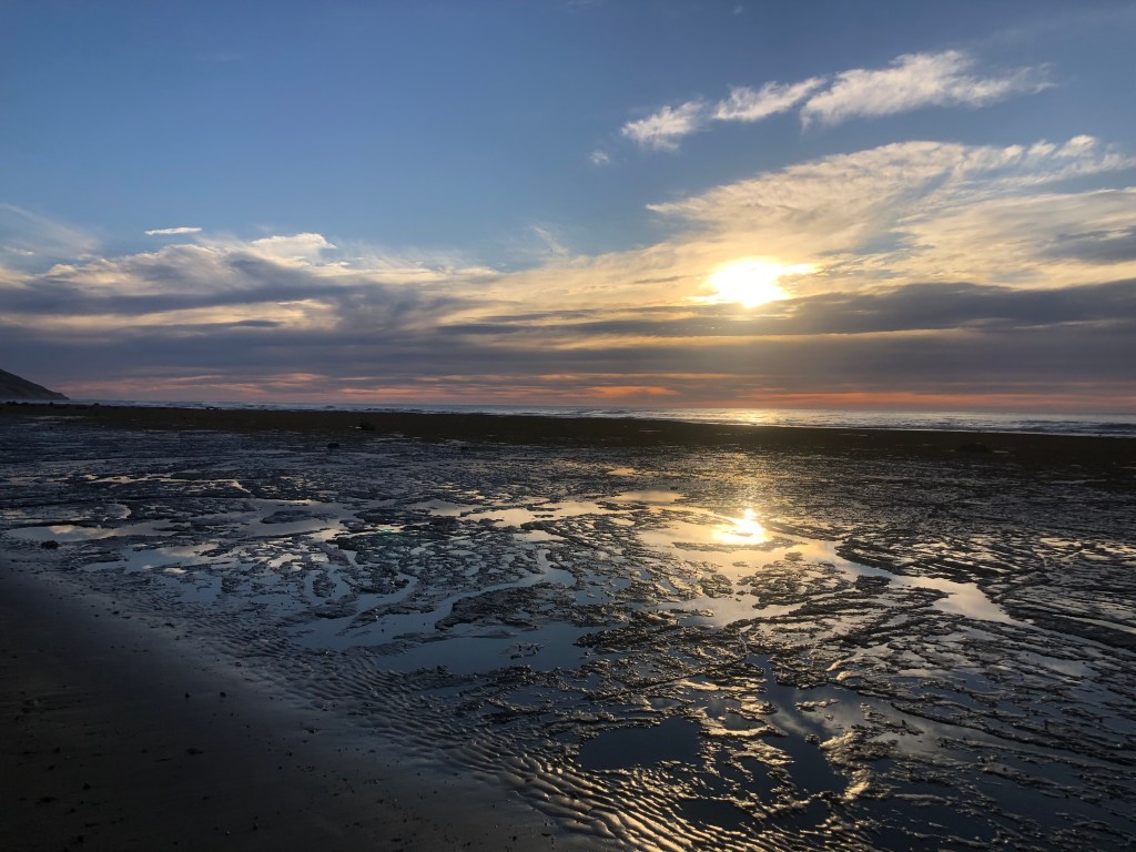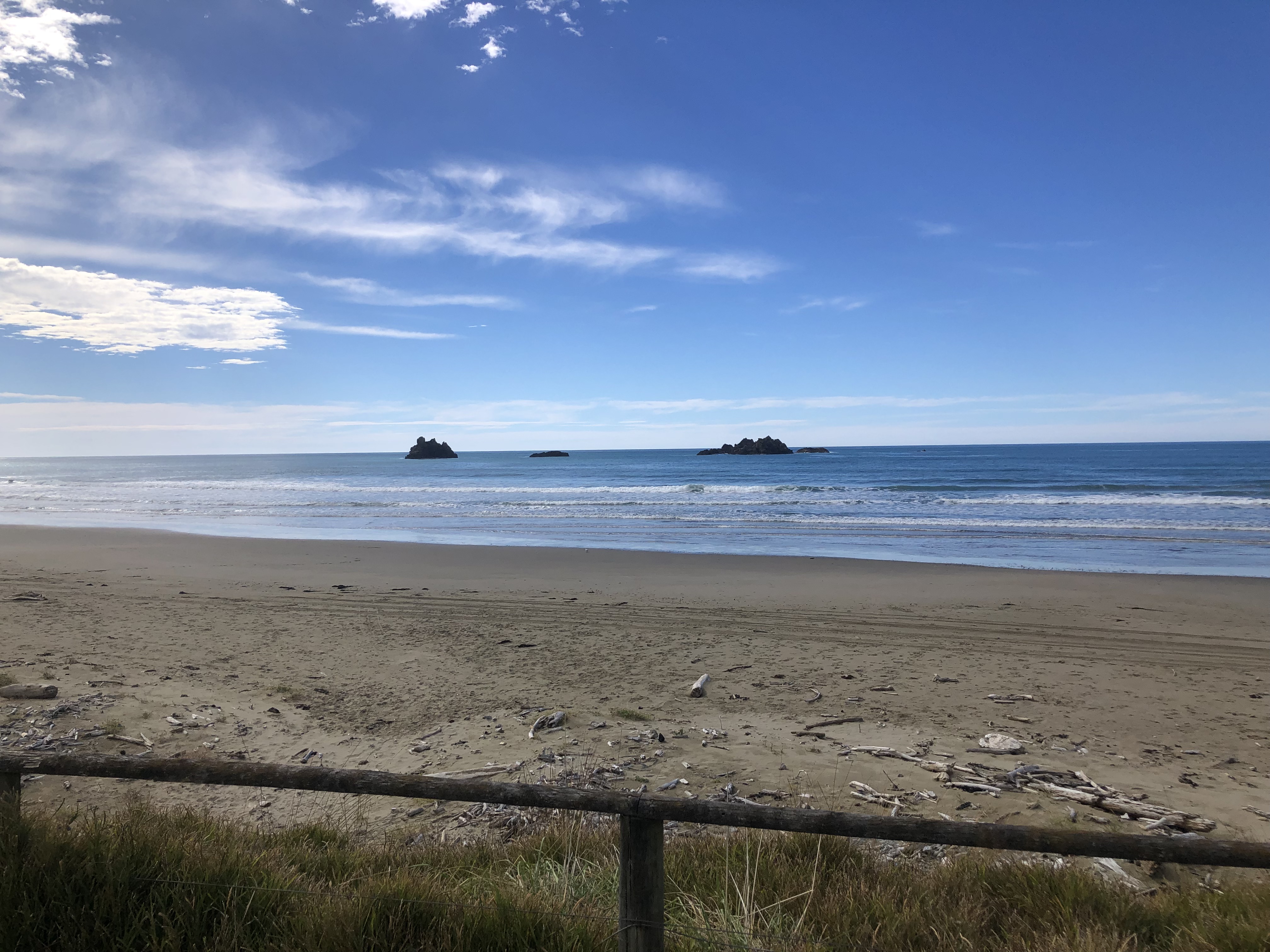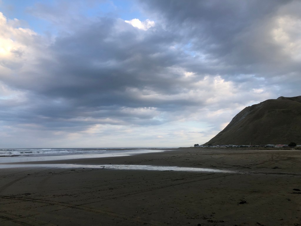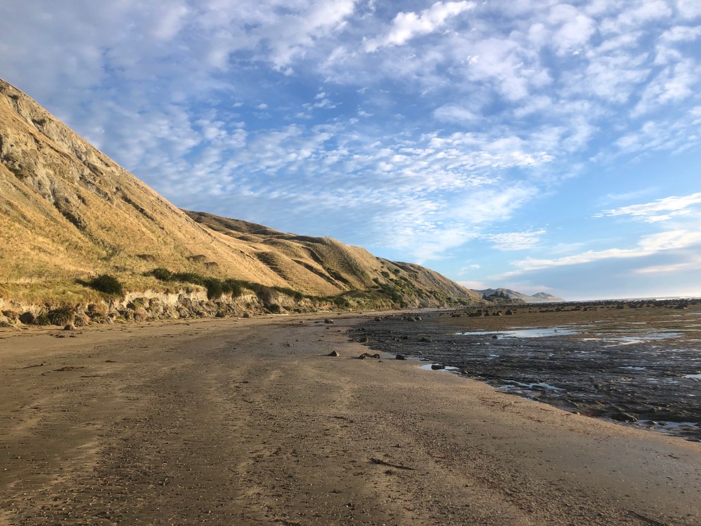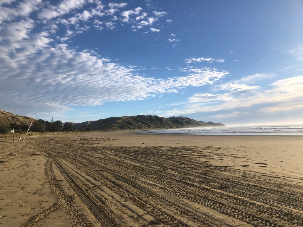 Schnell war das Zelt und meine Taschen wieder gepackt und ich saß auf dem Rad, bereit für den zweiten Tag. Meine Beine hatten sich überraschenderweise über Nacht gut erholt, am Vorabend war ich mir nicht so sicher, ob sie den zweiten Tag überleben würden… vor allem, da doch einiges an Höhenmetern anstand. Aber zunächst ging es flach am Strand entlang bis nach Pourerere Beach, und es war einfach traumhaft!! Bei Sonnenaufgang und Ebbe allein auf dem harten Sand entlang zu fahren, mit Blick auf das Meer und die Küste – das war wie in einem Film, fast schon kitschig!