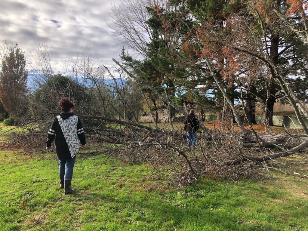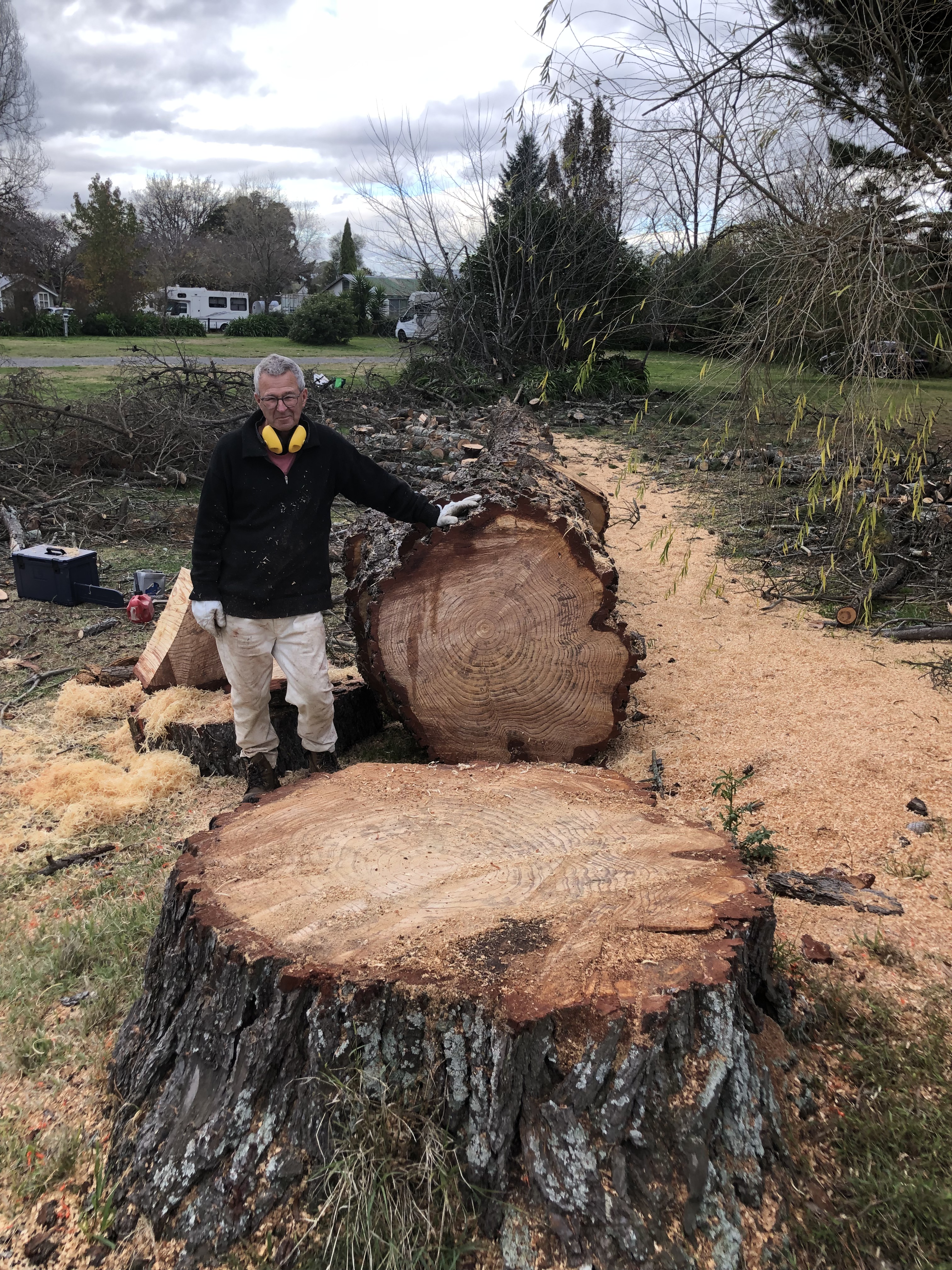 Um der Kälte im Haus entgegen zu wirken, braucht es jede Menge Feuerholz. Praktischerweise musste eine unserer 65 Jahre alten Kiefern gefällt werden, weil der Baum als Folge der Überschwemmung gestorben war. Und so waren Paddy und ich (teilweise mit Sams Hilfe) zwei Wochen damit beschäftigt, den gefällten Baum mit Hilfe von Kettensägen und Woodsplitter in handliches Feuerholz zu „verwandeln“. F… waren die Ringe schwer!!! Das war ein gutes Workout, da konnte ich mir das Fitnessstudio locker sparen! Hier ein paar Eindrücke: Der gerade gefällte Baum: