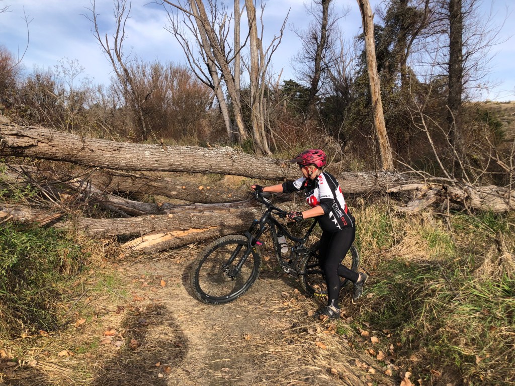 Zwischen den group rides bin ich entweder alleine unterwegs oder mit Sandy, meiner Trainingspartnerin, und hin und wieder auch mal auf dem Mountainbike, wie hier (nach einem stürmischen Tag, der den Baum auf den trail blies):