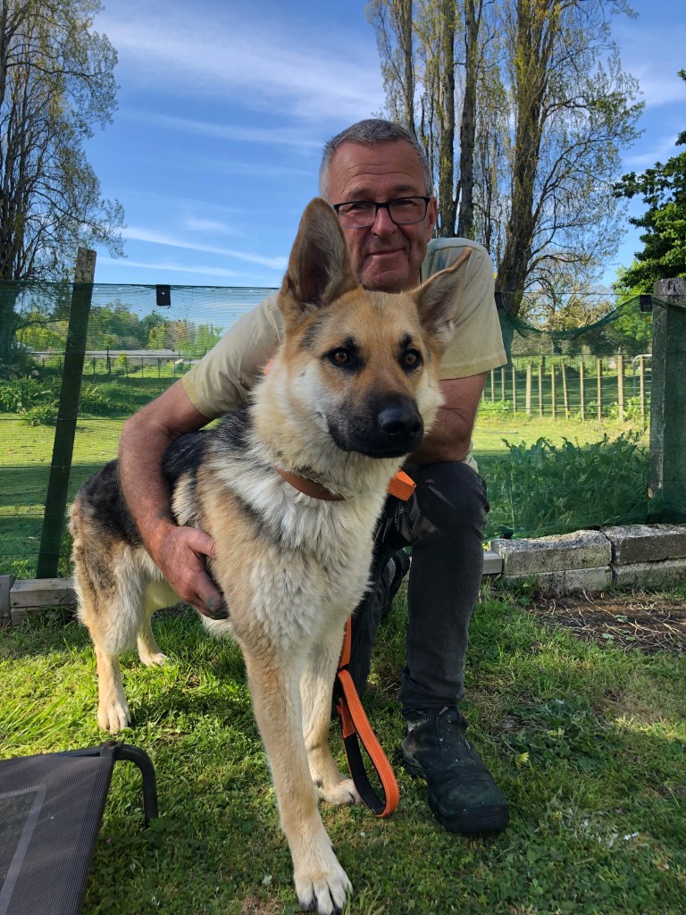Er ist super-verschmust und könnte sich 24 Stunden am Tag streicheln lassen. Er liebt Menschen (was auf einem Campingplatz gut ist), weil sie alle potentielle Streichler sind, und die meisten Hunde. Nur mit Livi’s (Paddy’s Tochter) Hund Dusty scheint er irgendwie ein Problem zu haben, den bellt er aus voller Lunge aus. Wir haben uns noch nicht getraut, ihn von der Leine zu lassen mit Dusty, aber wahrscheinlich wäre er dann ok. Mit Steve’s Schäferhunden hat das zumindest echt gut geklappt – nach anfänglichem Knurren und Hierarchie-Klarstellen sind alle drei durch Steve’s Riesengarten getollt: