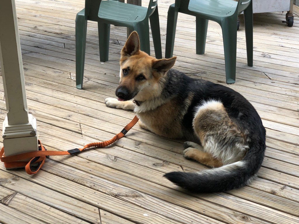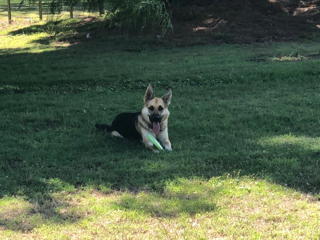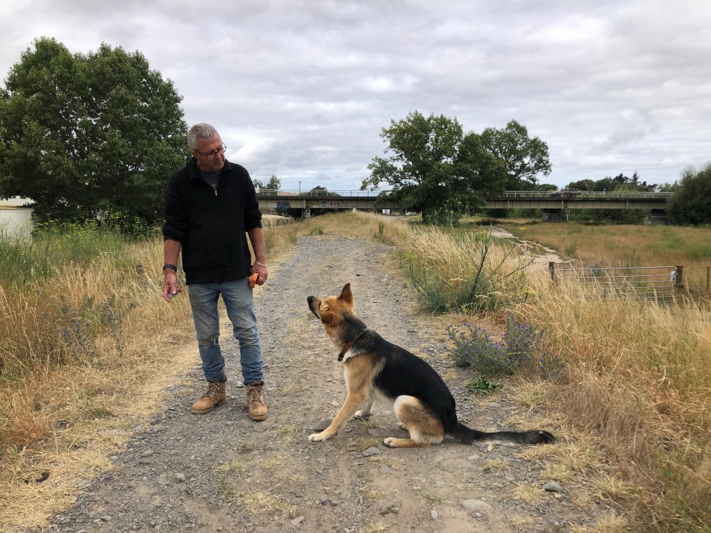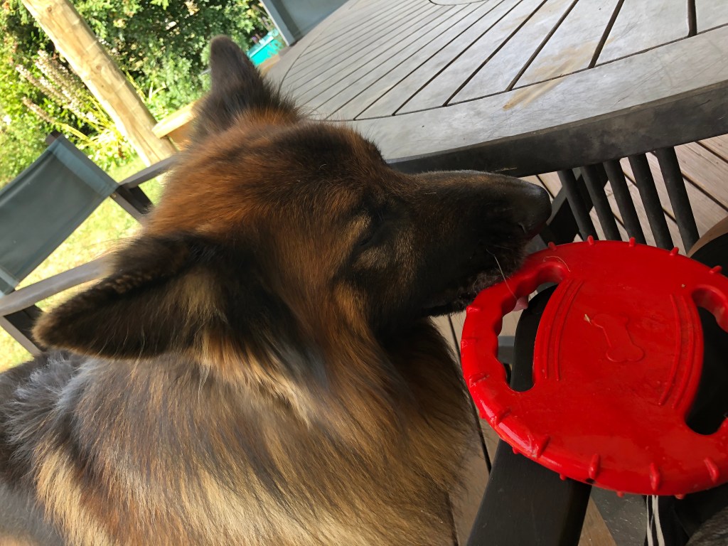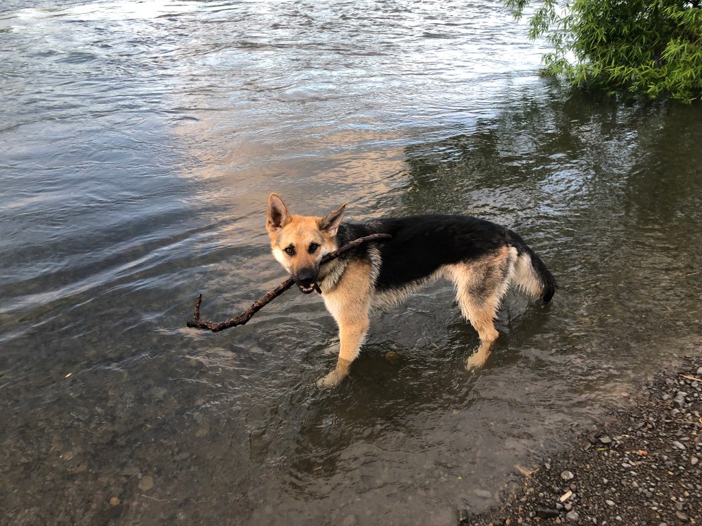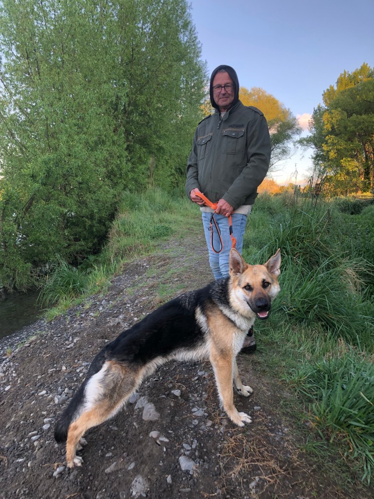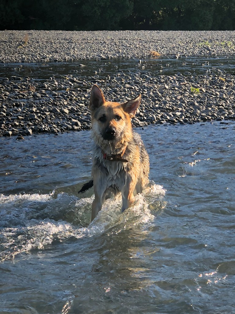 Wir gehen jeden Tag zweimal eine Stunde mit ihm spazieren, und zwischendurch gibt es immer mal wieder eine kurze Frisbee-Spieleinheit im Garten oder einen Run auf dem benachbarten Flussdamm. Inzwischen traut er sich auch ins Wasser (noch nicht schwimmen) – das kannte er wohl bis dahin gar nicht.