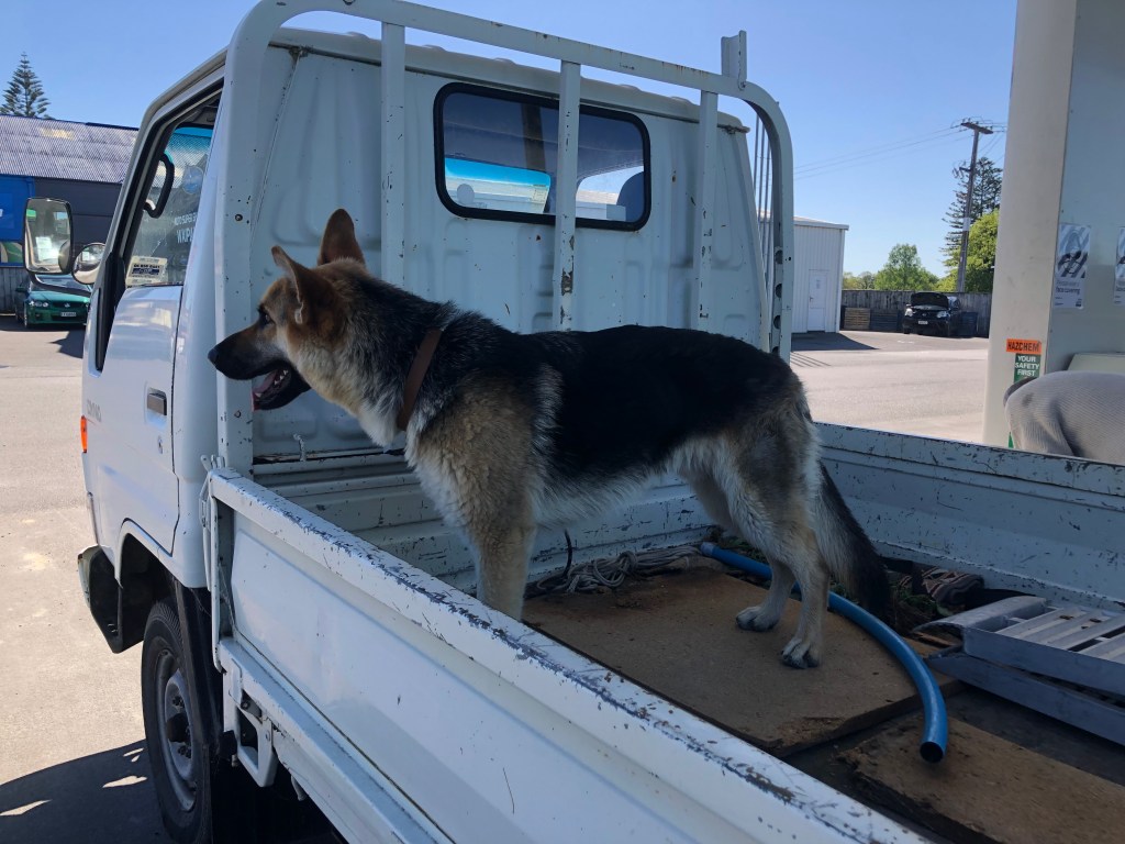 Er liebt übrigens das Truckfahren, allerdings leider nur mit uns vorne in der Kabine, was für mich sehr eng und ungemütlich ist. Aber sobald er eine offene Truck- oder Autotür sieht, ist er drin – das ist etwas anstrengend mit anderer Leute Autos, da ist er nicht so wählerisch 😉