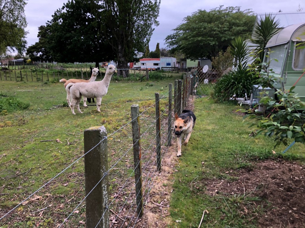 Harvey und die Alpacas – er sprintet am Zaun entlang wie ein Verrückter, die Alpacas schauen nur.Wahrscheinlich denken sie „warum macht denn der so einen Lärm???“